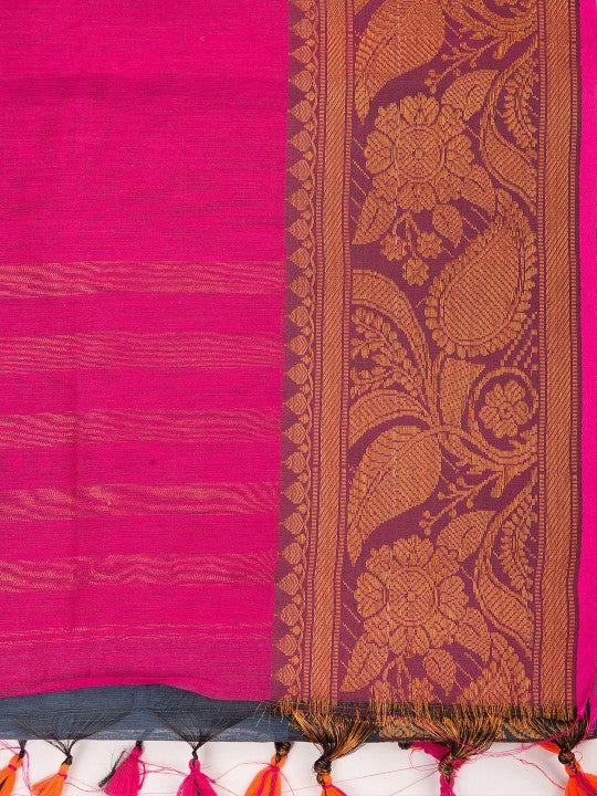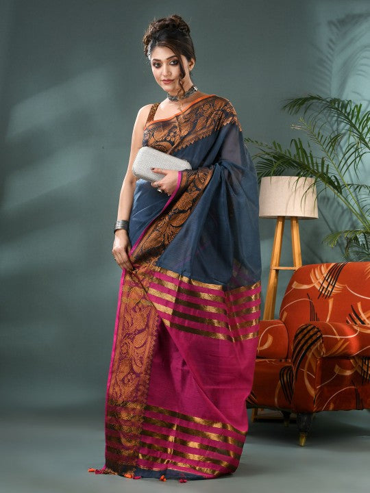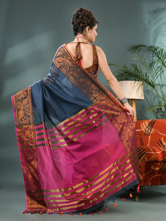Blue and purple kanjeevaram saree. Solid saree with woven design border. Has zari detail. The saree comes with an unstitched blouse piece. The blouse worn by the model might be for modelling purpose only. Check the image of the blouse piece to understand how the actual blouse piece looks like.