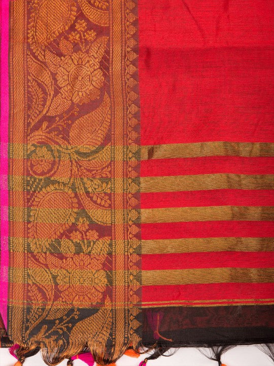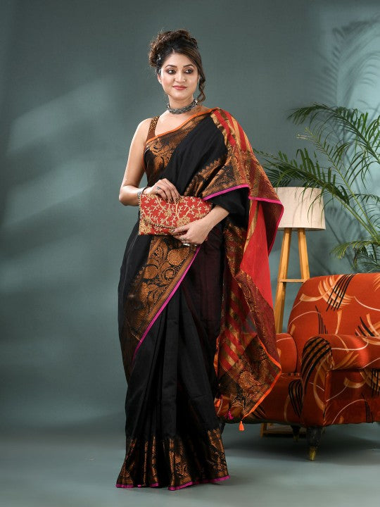 This elegant DESH BIDESH Zari Silk Cotton Kanjeevaram Saree is designed for women, featuring a striking black and red color combination. It showcases a solid saree body complemented by an intricately woven design border, adding traditional charm. The saree is further enhanced with delicate zari detailing, lending a rich and luxurious appeal. Each purchase includes an unstitched blouse piece, providing the flexibility for a custom fit. Please note that the blouse worn by the model is for styling purposes only; refer to the provided image of the blouse piece for its actual appearance. This saree, identified by Style ID: 35204982, offers a blend of classic aesthetics and contemporary wearability. It is crafted from high-quality silk cotton, ensuring comfort and a graceful drape. Perfect for festive occasions, weddings, or cultural gatherings, this Kanjeevaram saree makes a sophisticated statement. Its vibrant hues and detailed workmanship reflect authentic Indian textile artistry. Experience timeless elegance and traditional grandeur with this exquisite piece.