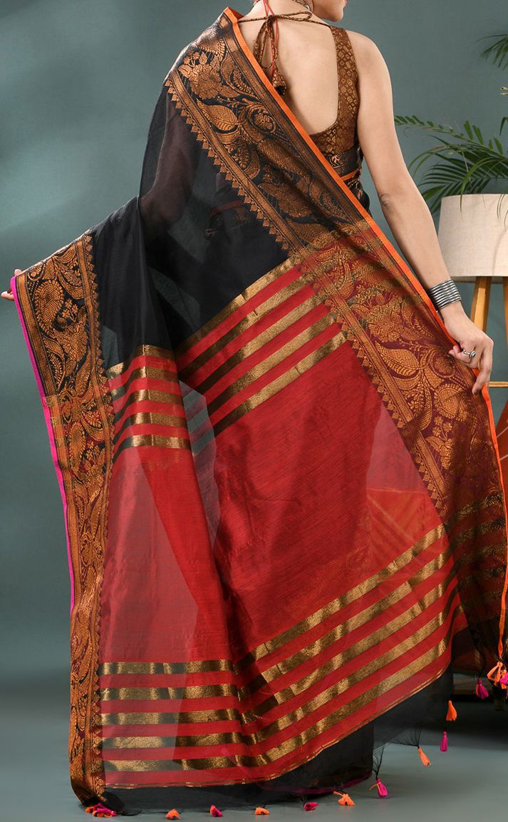 Description This elegant DESH BIDESH Zari Silk Cotton Kanjeevaram Saree is designed for women, featuring a striking black and red color combination. It showcases a solid saree body complemented by an intricately woven design border, adding traditional charm. The saree is further enhanced with delicate zari detailing, lending a rich and luxurious appeal. Each purchase includes an unstitched blouse piece, providing the flexibility for a custom fit. Please note that the blouse worn by the model is for styling purposes only; refer to the provided image of the blouse piece for its actual appearance. This saree, identified by Style ID: 35204982, offers a blend of classic aesthetics and contemporary wearability. It is crafted from high-quality silk cotton, ensuring comfort and a graceful drape. Perfect for festive occasions, weddings, or cultural gatherings, this Kanjeevaram saree makes a sophisticated statement. Its vibrant hues and detailed workmanship reflect authentic Indian textile artistry. Experience timeless elegance and traditional grandeur with this exquisite piece.