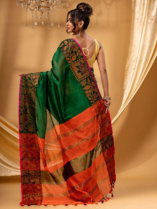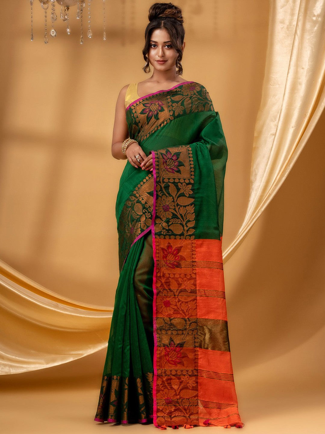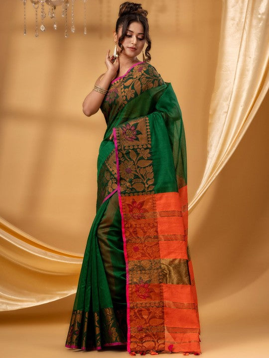 Green and orange taant saree. Solid saree with woven design border border. Has zari detail. The saree comes with an unstitched blouse piece. The blouse worn by the model might be for modelling purpose only. Check the image of the blouse piece to understand how the actual blouse piece looks like.