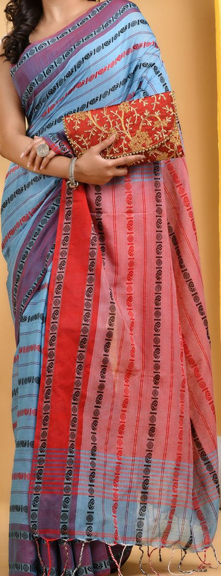 This elegant saree features a beautiful woven design, perfect for traditional occasions. Crafted from pure cotton fabric, it ensures comfort and breathability throughout the day. The rich blue and red colour combination adds a vibrant touch to your ethnic wardrobe. It comes with an unstitched blouse piece, allowing for customisation to your unique style. The intricate woven border enhances the overall aesthetic appeal of the saree. This versatile garment is ideal for festivities, weddings, or cultural gatherings. Its lightweight nature makes it easy to drape and carry with grace. The pure cotton material is gentle on the skin, providing a comfortable wearing experience. Pair it with traditional jewellery and accessories to complete your stunning look. Embrace timeless elegance and traditional charm with this exquisite pure cotton saree.