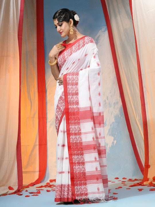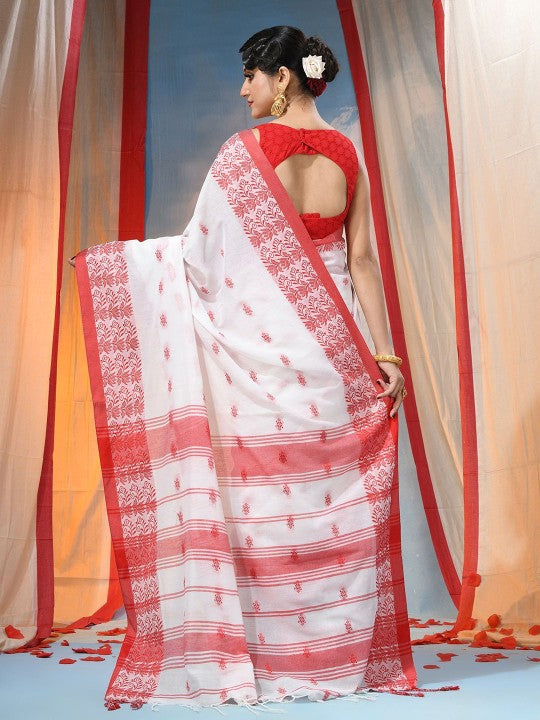 Unleash your inner diva with this exquisite red and white floral embroidered handloom saree! Crafted from a comfy cotton blend, it drapes like a dream and feels as light as a feather. The intricate floral design and woven border add a touch of traditional charm, making you the star of any occasion. This beauty comes with an unstitched blouse piece for a customized fit. Get ready to turn heads and dance your way through festivities with this stunning saree. It's truly a timeless piece for your ethnic wardrobe!