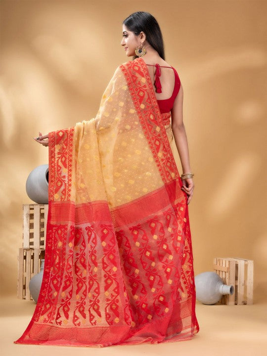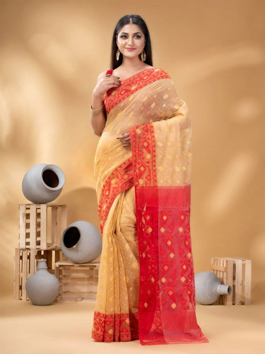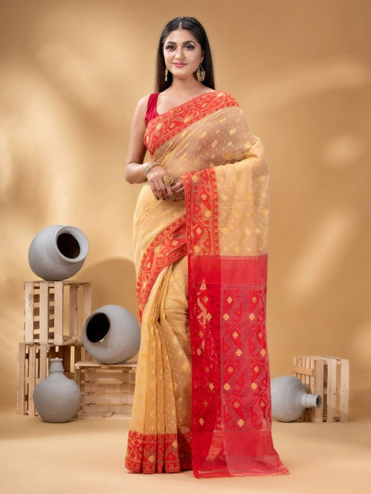 This exquisite Jamdani saree, presented by DESH BIDESH, is meticulously crafted from pure cotton, offering both grace and comfort. It features an intricate woven design with delicate zari detailing, elevating its traditional aesthetic. The cream-coloured and red palette creates a striking visual appeal, making it suitable for various celebratory occasions. Its lightweight fabrication ensures a fluid drape, enhancing the wearer's silhouette. The saree includes a beautifully designed woven border, reflecting artisanal heritage. This garment represents a perfect fusion of classic Indian textile artistry and contemporary elegance. It is an ideal choice for those seeking refined ethnic wear with a distinctive character. The quality construction promises durability and enduring beauty. This piece is a testament to timeless sartorial excellence.