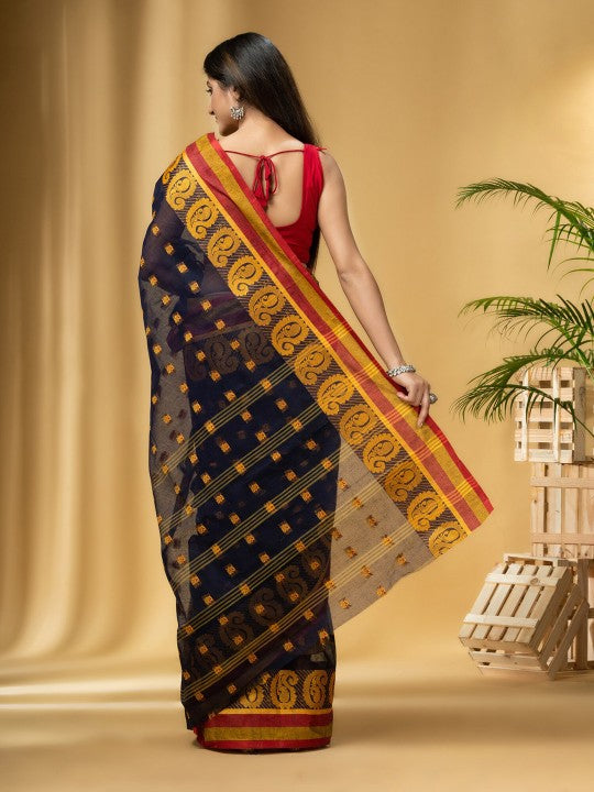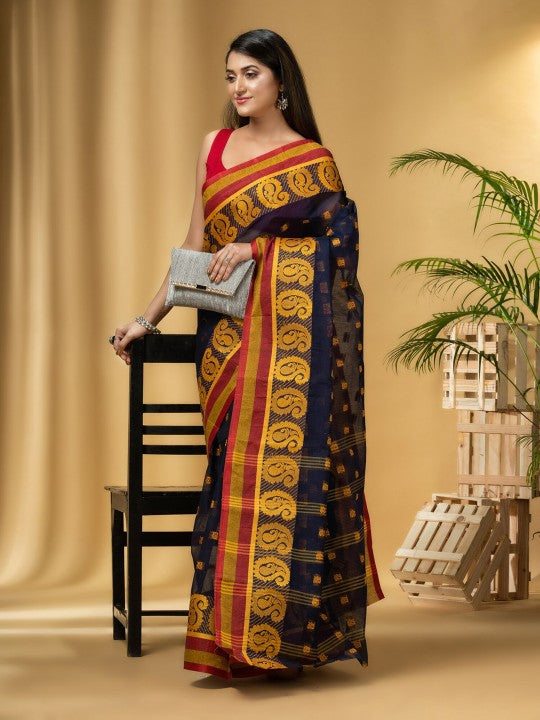 Experience timeless elegance with the DESH BIDESH Ethnic Motifs Pure Cotton Taant Saree. This exquisite saree features a captivating woven design showcasing traditional ethnic motifs. Crafted from pure cotton, it ensures exceptional comfort and breathability for all-day wear. The vibrant blue, red, and yellow hues blend harmoniously, creating a striking visual appeal. A classic solid border frames the intricate design beautifully. This handloom taant saree reflects rich cultural heritage and skilled artistry. It is perfect for festive occasions, traditional gatherings, or daily ethnic wear. Please note, the saree does not include a separate blouse piece; the model's blouse is for styling purposes only. Dry cleaning is recommended to maintain its pristine quality and vibrant colours. Elevate your ethnic wardrobe with this graceful and authentic Indian saree.