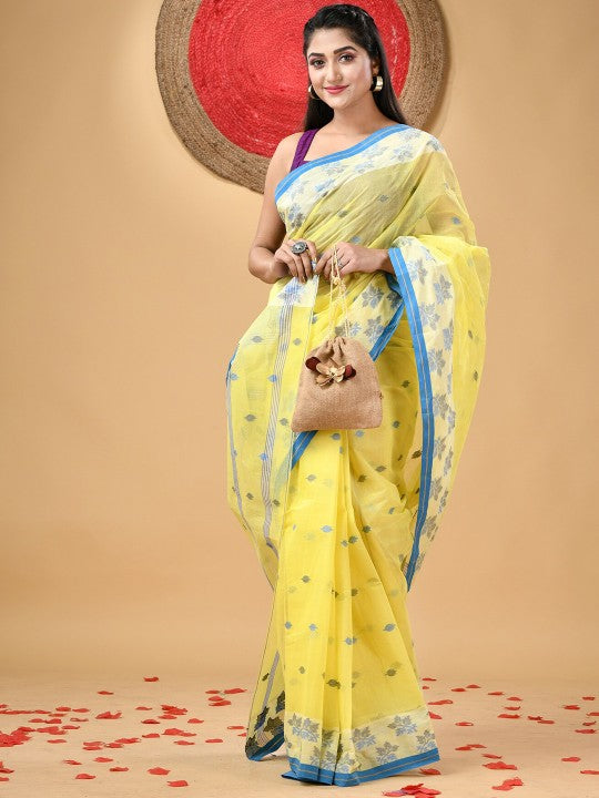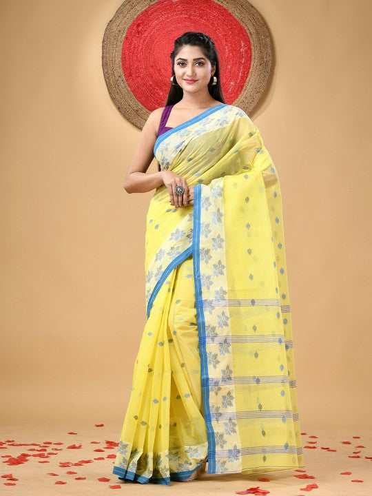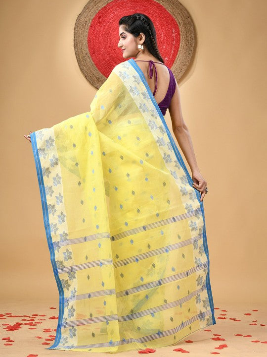 This exquisite saree, crafted from pure cotton, features intricate ethnic motifs woven into its design. The lightweight Taant weave ensures comfort and effortless draping, making it ideal for various occasions. It showcases a beautiful border with a complementary woven pattern, adding to its traditional charm. The saree is designed without a blouse piece, allowing for personalized styling options. Its vibrant yellow hue and delicate blue accents create a striking visual appeal. This garment embodies timeless elegance and cultural heritage.