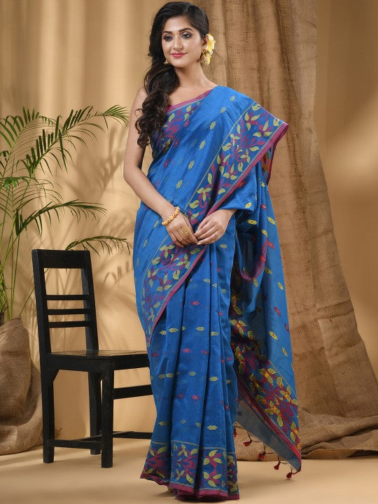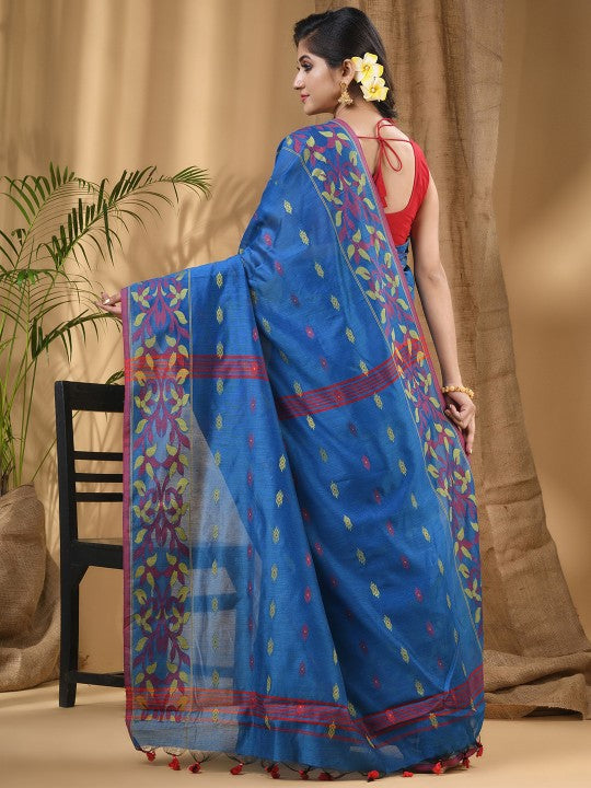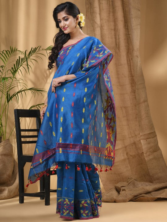 Exquisite Blue-Green Woven Design Silk Cotton Taant Saree for Women