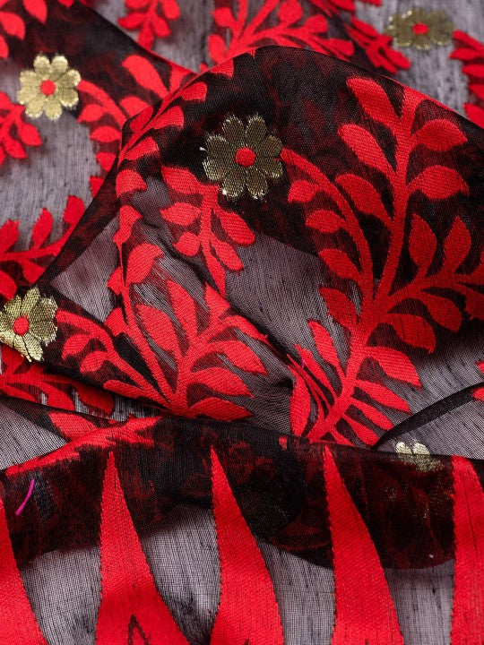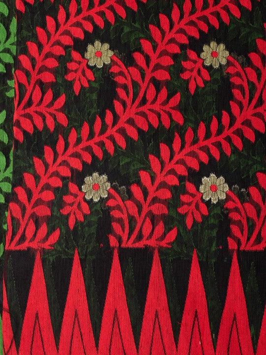 This exquisite DESH BIDESH Jamdani Saree features a striking woven design, meticulously crafted from pure cotton. The rich red and green hues are expertly interwoven, creating a vibrant visual appeal. Its intricate tamarind leaf motif, characteristic of Jamdani weaving, adds a touch of traditional artistry. The saree's lightweight pure cotton fabric ensures exceptional comfort and breathability throughout the day. A sophisticated woven border enhances its elegant drape and finish. This garment is ideal for festive occasions, cultural gatherings, or refined daily wear. Its timeless design and superior craftsmanship make it a valuable addition to any discerning wardrobe. The saree's durable yet soft texture promises lasting quality and ease of maintenance with dry cleaning. Embodying classic Indian textile heritage, this piece reflects an unparalleled dedication to traditional weaving techniques.