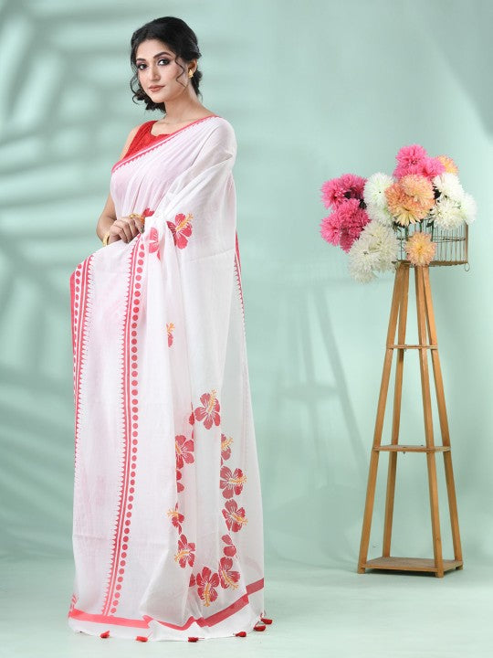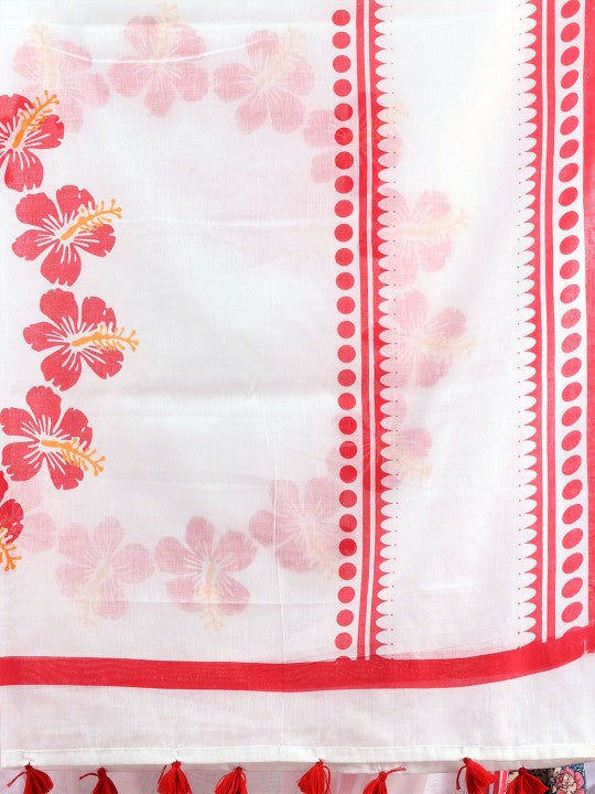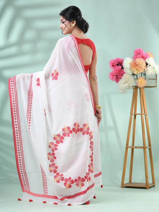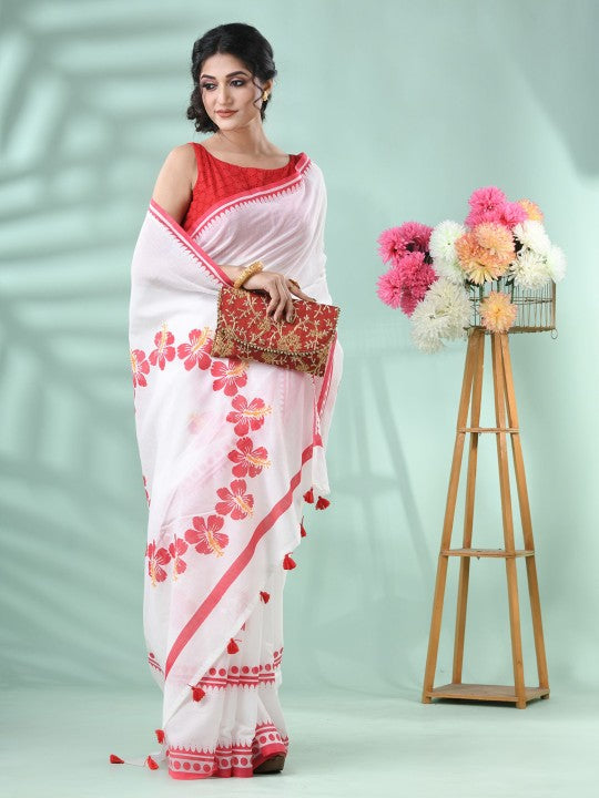 Exquisite Floral Printed Handloom Saree: Red & White, Cotton Blend, Traditional Indian Wear