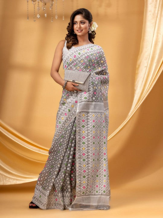 Hirokduti Resham Dhakai jamdani Bengal Pure Cotton Handloom Saree Whole Body Design without Blouse Piece