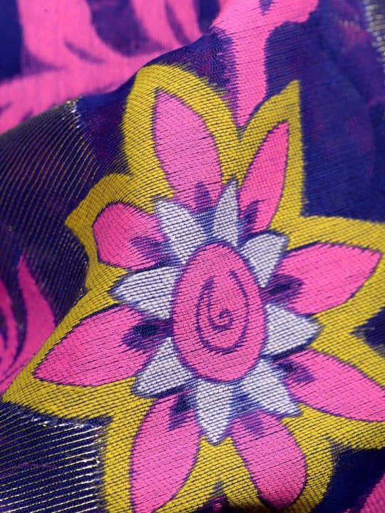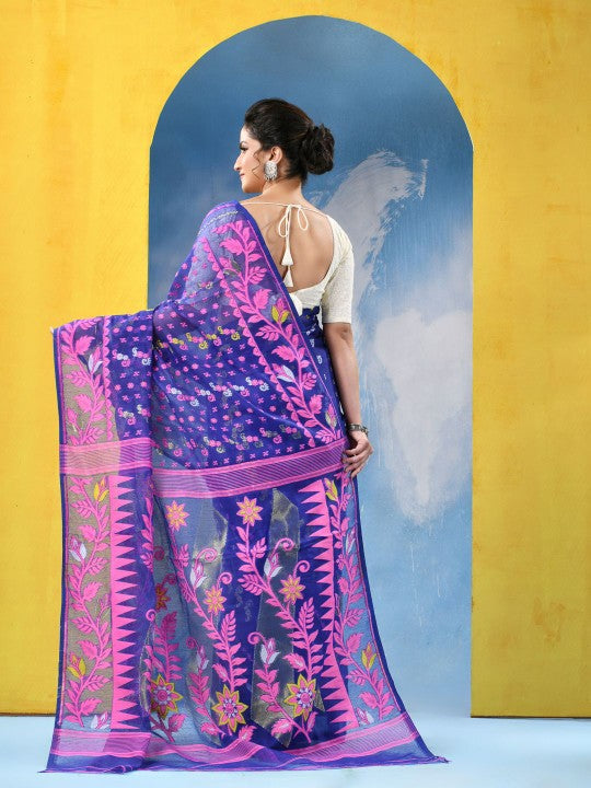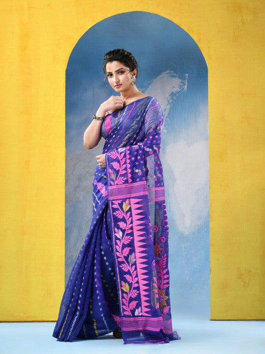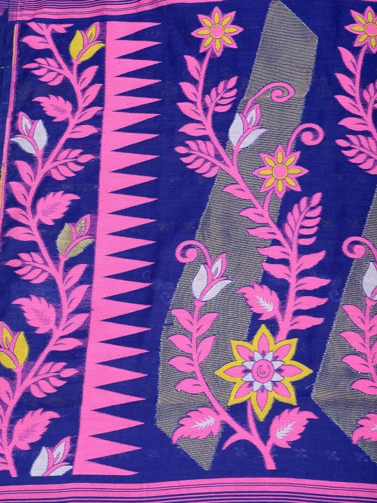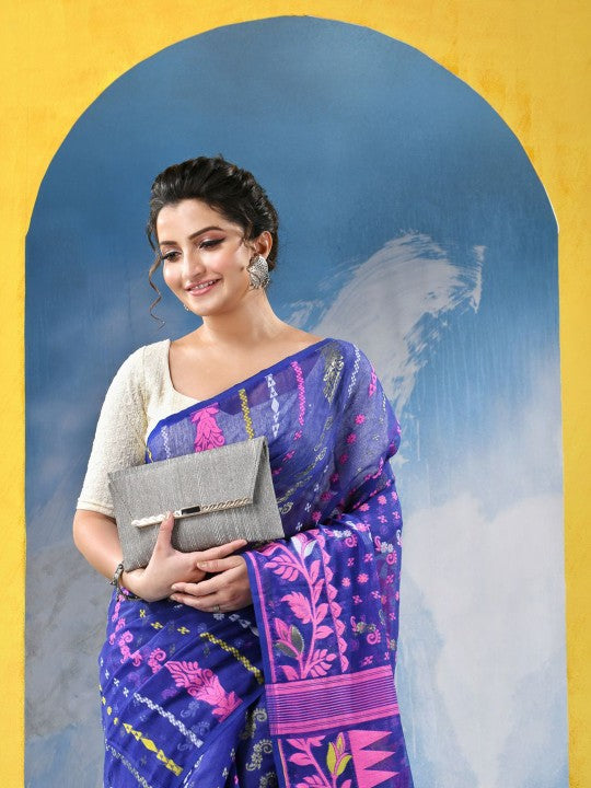 Exquisite Jamdani Cotton Blend Saree: Blue & Pink Woven Design with Solid Border