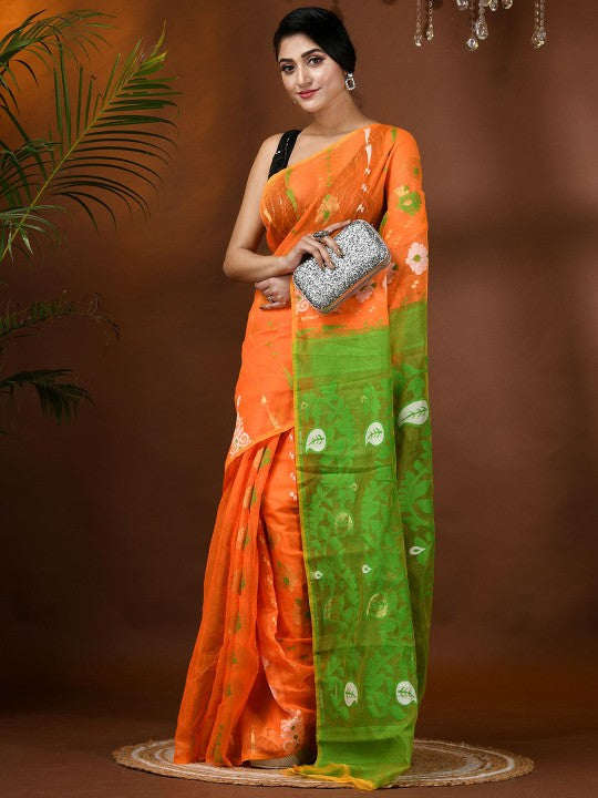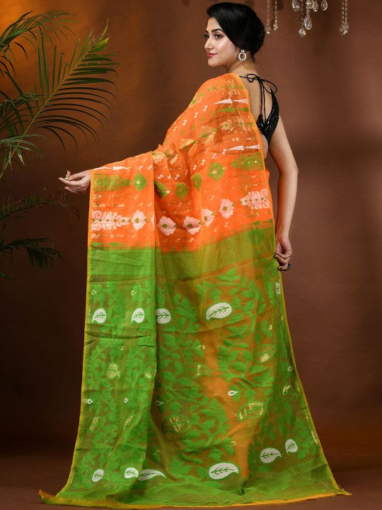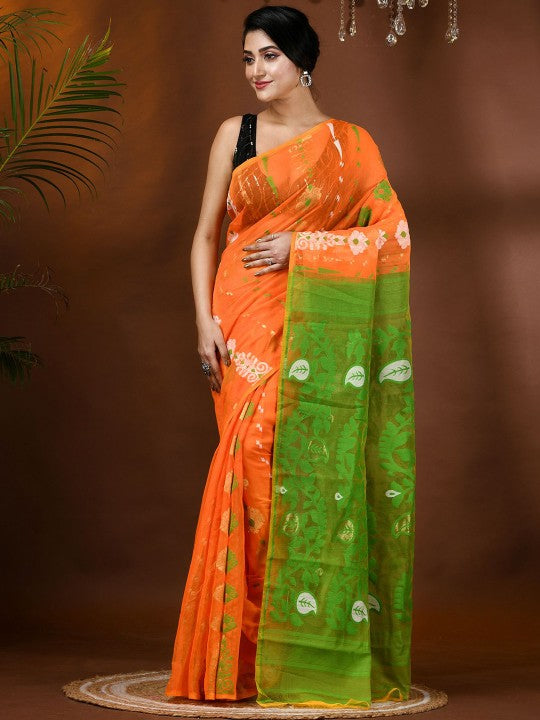 | Design Details | Orange and green Jamdani saree; Ethnic motifs woven design saree with solid border |