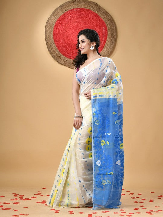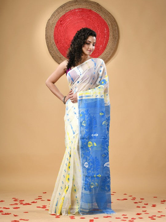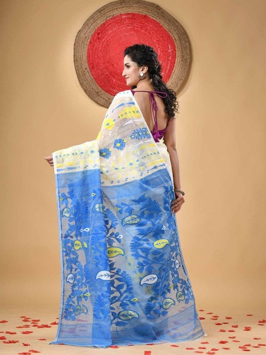 | Design Details | White and blue jamdani saree with paisley woven design and solid border |