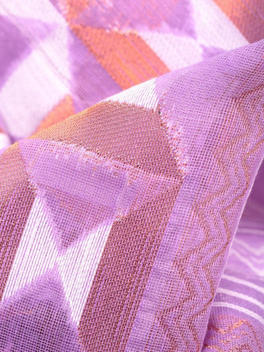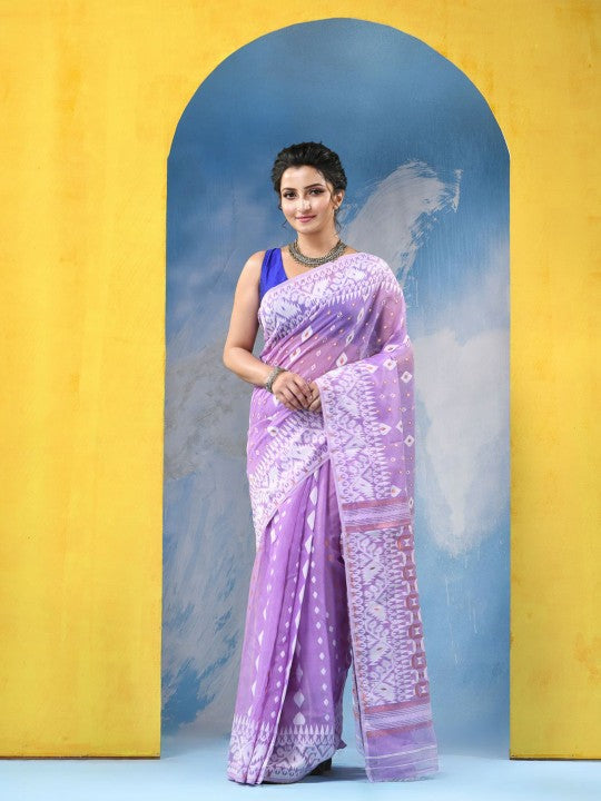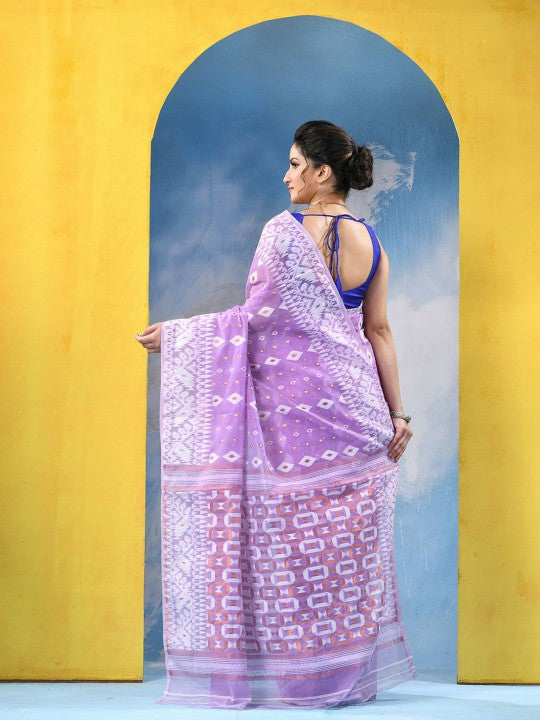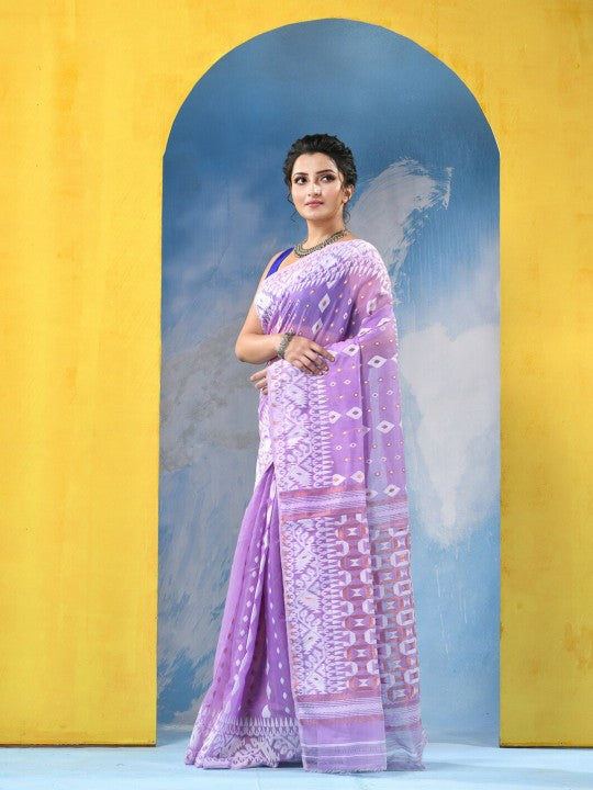 This exquisite lavender and gold-toned Jamdani saree, crafted from a luxurious cotton-silk blend, showcases a sophisticated woven design with intricate zari detailing. The saree embodies traditional artistry, offering a timeless elegance that is both rich in heritage and contemporary in appeal. Its soft texture ensures comfort, while the golden zari work adds a subtle shimmer, making it ideal for various occasions. This handloom creation reflects meticulous craftsmanship, ensuring a unique and high-quality garment. The saree's design seamlessly blends classic motifs with a modern aesthetic, presenting a versatile addition to any discerning wardrobe. This piece is a testament to the enduring beauty of Indian textiles, perfect for those who appreciate refined craftsmanship and cultural depth. The fabric drapes gracefully, enhancing the silhouette and providing a flattering fit. This saree is a perfect choice for festive gatherings, formal events, or cultural celebrations, exuding an aura of understated luxury.