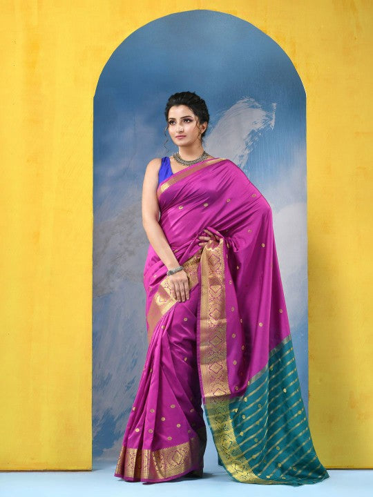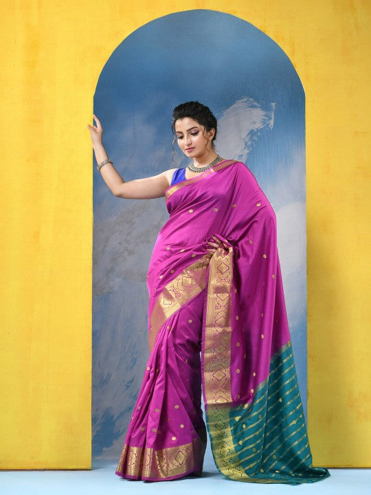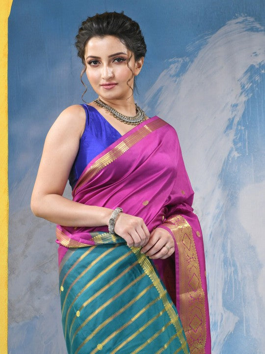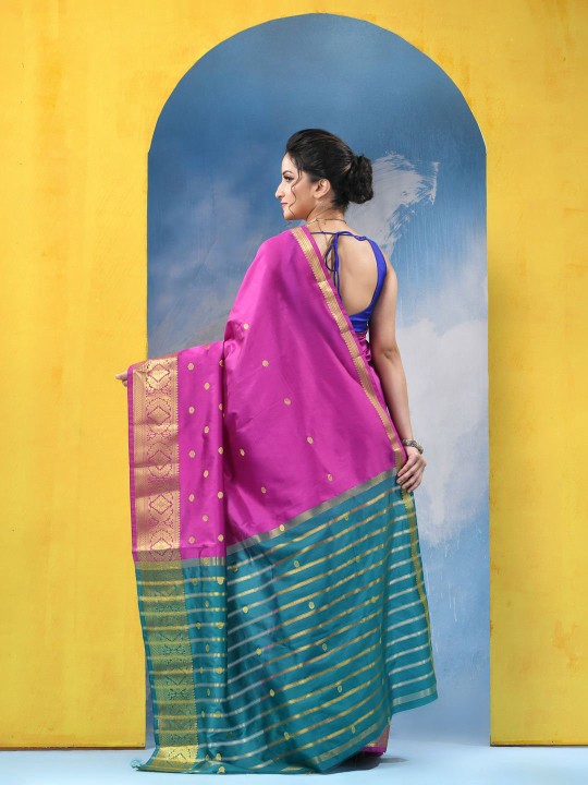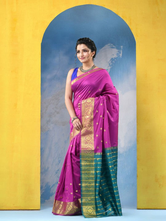 This magnificent magenta and green Kanjeevaram saree exemplifies traditional Indian craftsmanship. It features intricate woven design borders and rich zari detailing, highlighting its luxurious silk blend fabric. The saree is accompanied by an unstitched blouse piece, allowing for a custom fit and personal styling. The design is a testament to timeless elegance, perfect for special occasions. Its vibrant color palette and detailed weaving make it a standout piece in any wardrobe. This saree offers both comfort and sophistication, reflecting the rich heritage of Indian textiles. The fabric ensures a graceful drape, enhancing the wearer's silhouette. It is ideal for those who appreciate classic designs with a contemporary feel. This piece is a symbol of cultural richness and artistic excellence.