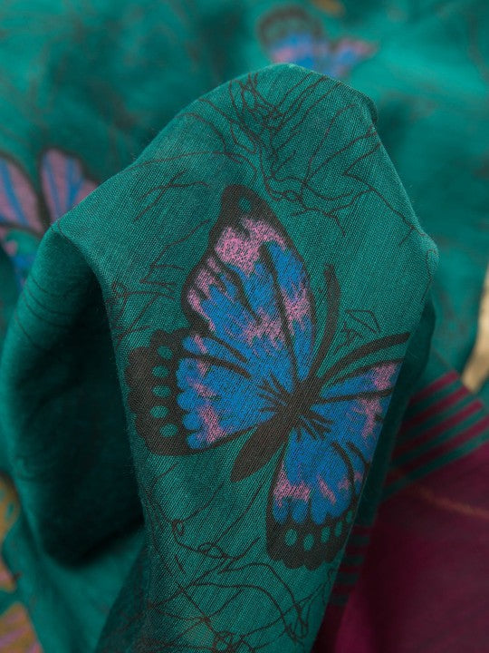 This exquisite saree, crafted with precision, showcases intricate ethnic motifs and a stunning woven design border. The rich maroon and vibrant green hues create a visually appealing contrast, making it suitable for various occasions. The saree is designed for elegance and comfort, ensuring a graceful drape. It is presented with an unstitched blouse piece, allowing for custom tailoring to achieve a perfect fit. The fabric choice ensures both durability and a luxurious feel, ideal for formal gatherings or festive celebrations. This piece reflects traditional Indian craftsmanship with a contemporary aesthetic. The meticulous detailing on the border adds a touch of sophistication, enhancing its overall allure. It is a perfect addition to any discerning wardrobe, offering versatility and timeless charm.