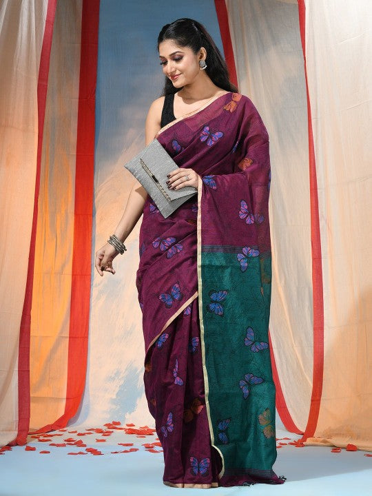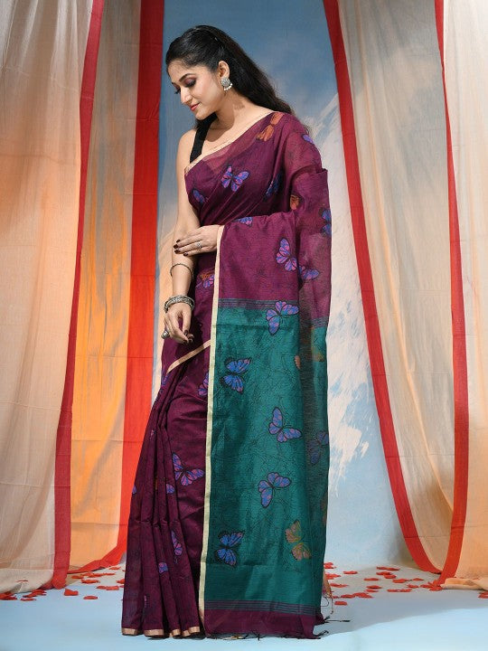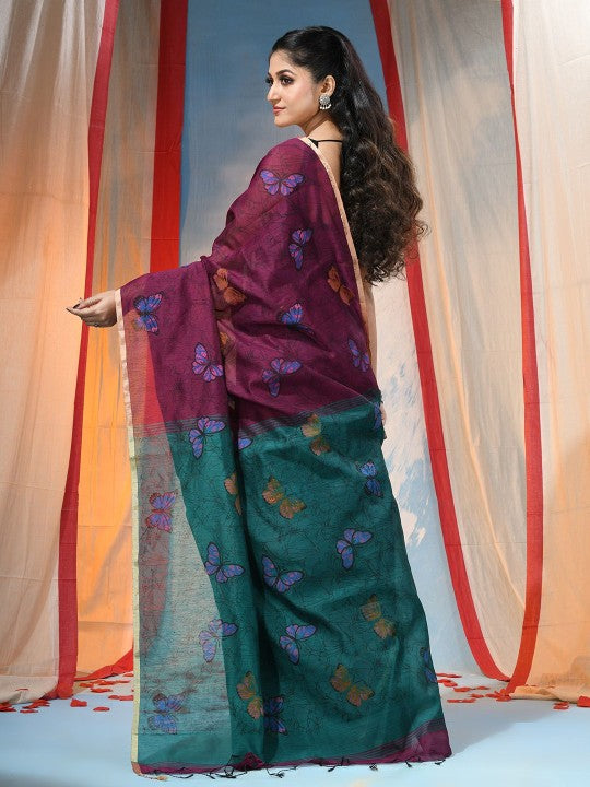 Exquisite Maroon & Green Ethnic Motifs Zari Saree with Woven Design Border