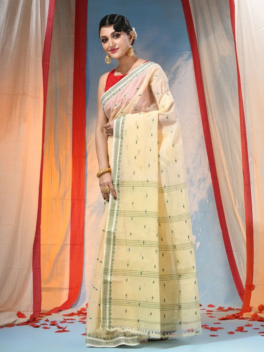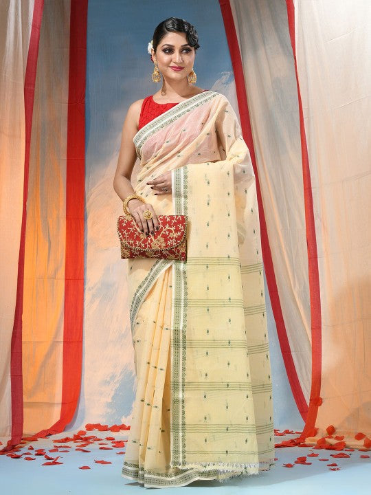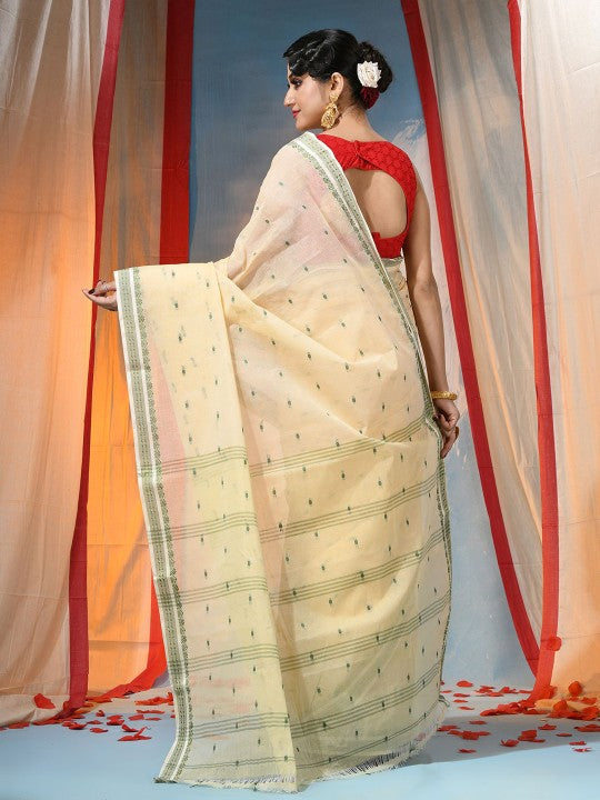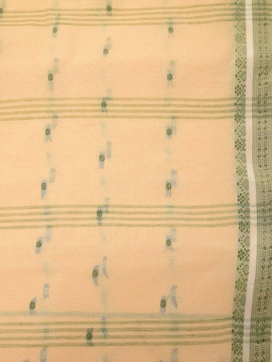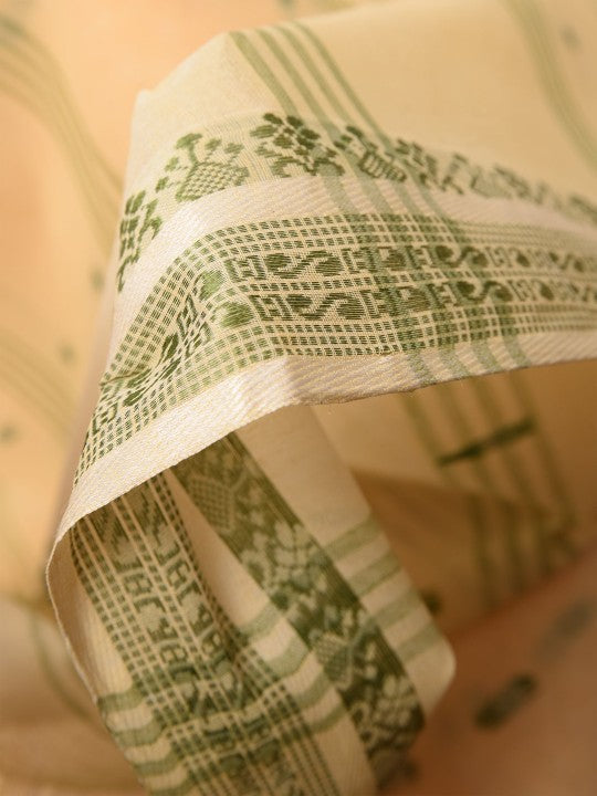 Exquisite Off-White & Green Pure Cotton Saree with Ethnic Woven Motifs