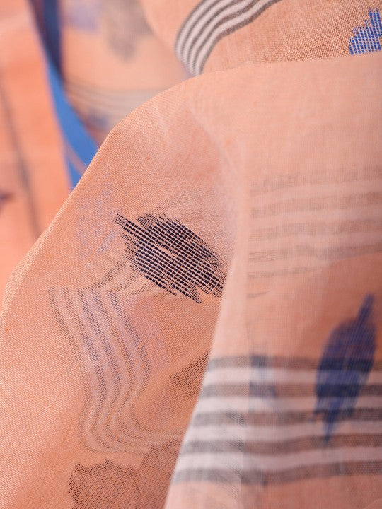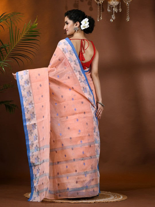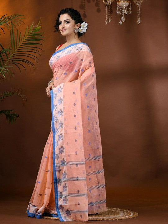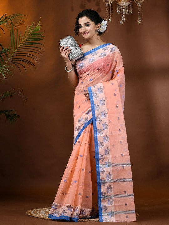 Exquisite Peach & Blue Pure Handloom Cotton Tant Saree with Woven Leaf Design in Deep Peach color