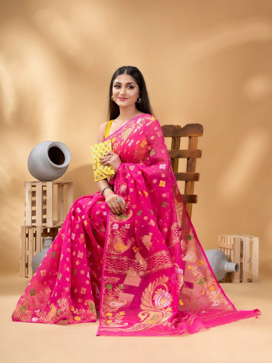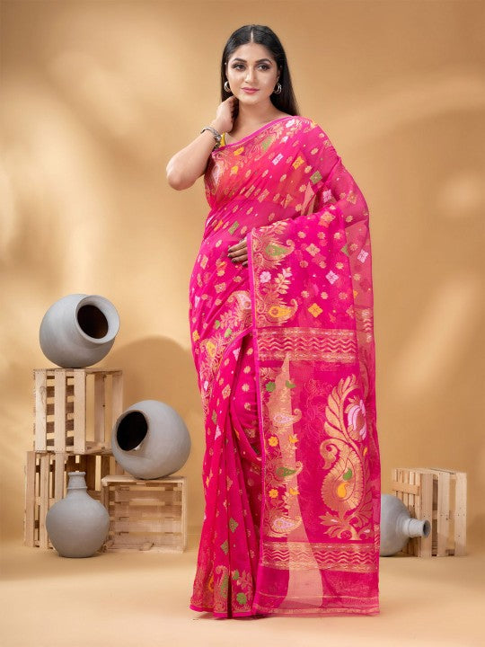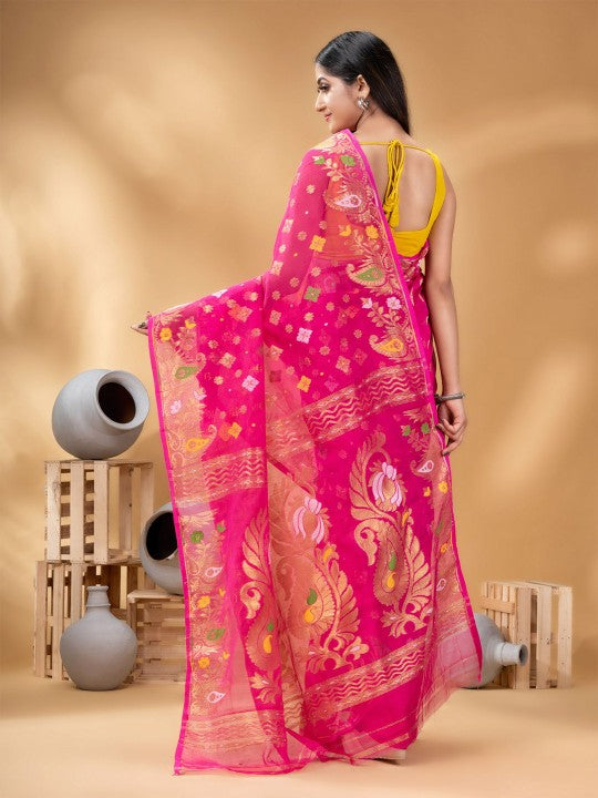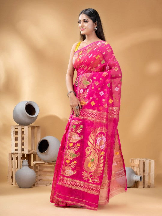 Exquisite Pink Gold-Toned Jamdani Saree with Woven Zari Design Border