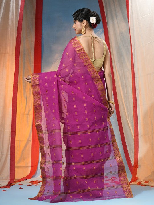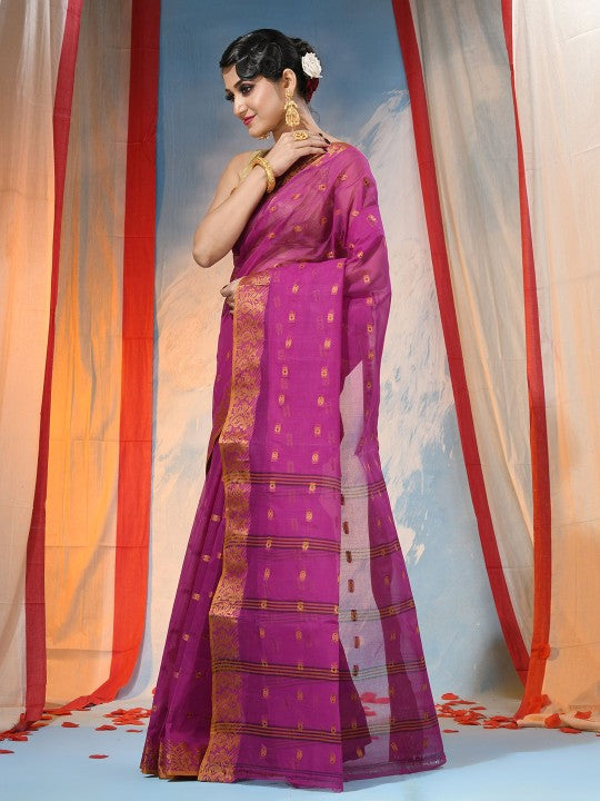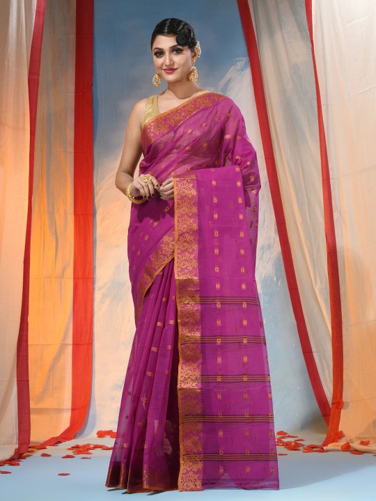 Embrace timeless elegance with this exquisite pink and gold-toned pure cotton handloom saree. The saree features a sophisticated paisley woven design, complemented by a meticulously crafted woven border, showcasing traditional artistry. It is adorned with intricate zari detailing, adding a touch of opulent shimmer. This saree is designed without a blouse piece, offering versatility for personal styling. Crafted from pure cotton, it ensures comfort and breathability, ideal for various occasions. The fabric's natural drape enhances its graceful appeal. This piece represents a blend of heritage and contemporary fashion. It requires dry cleaning to maintain its pristine condition and intricate embellishments. This traditional handloom saree is a testament to skilled craftsmanship and cultural richness.