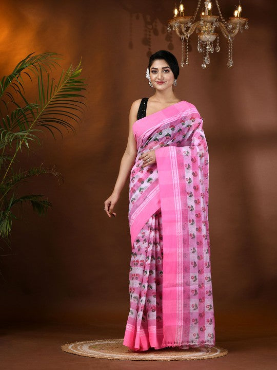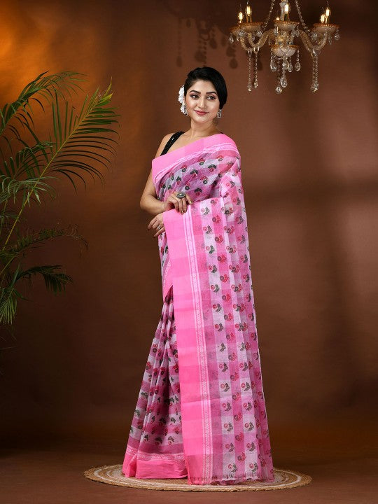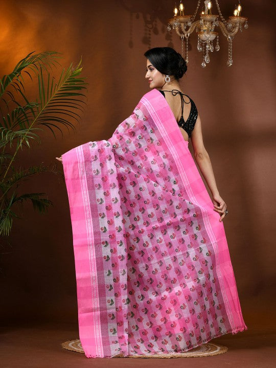 Exquisite Pink & White Pure Cotton Tant Saree with Ethnic Motifs