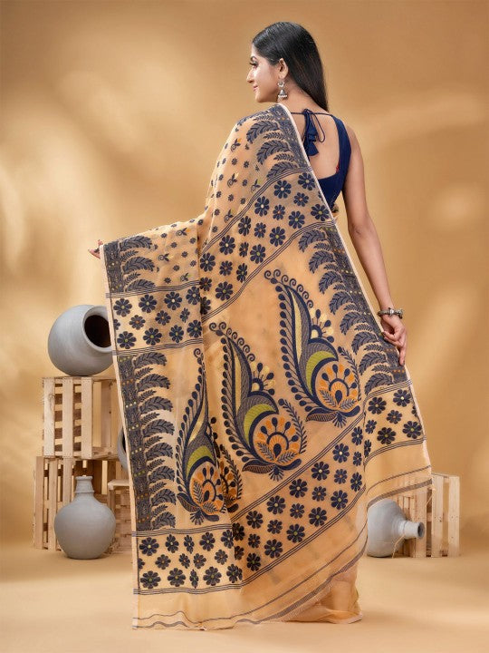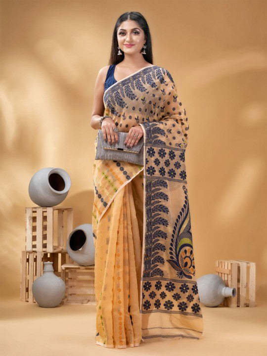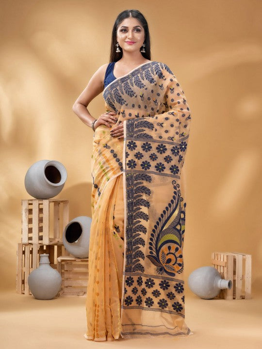 | Design Details | Orange and blue Jamdani saree with woven design border |