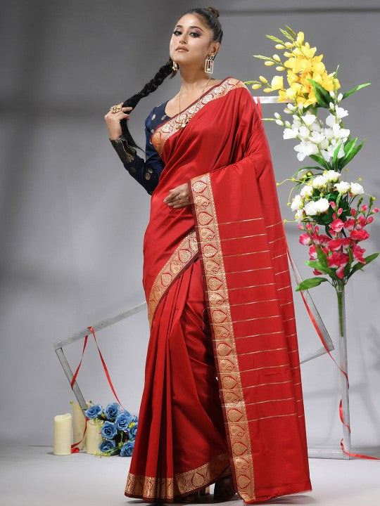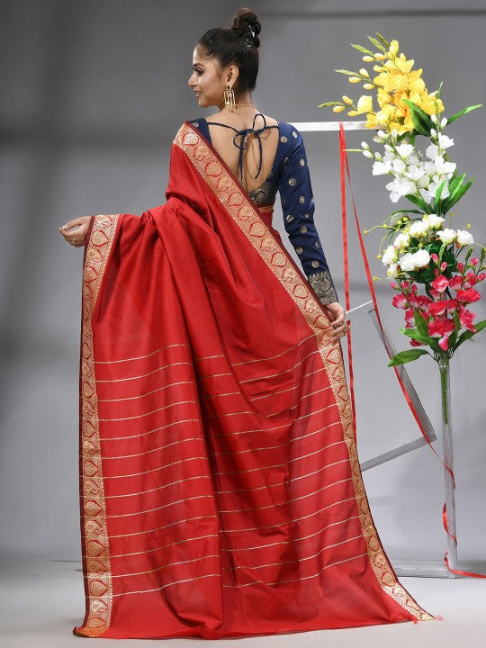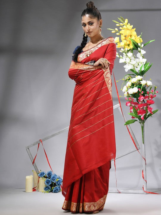 This exquisite red and gold-toned saree features a meticulously woven design with an elegant border, showcasing exceptional craftsmanship. The intricate zari detail adds a touch of traditional opulence, making it a perfect ensemble for festive occasions and cultural celebrations. Crafted from premium silk blend fabric, the saree drapes beautifully, offering both comfort and a luxurious feel. Its vibrant color palette and rich texture embody timeless Indian heritage, ensuring a distinguished appearance. The saree comes with an unstitched blouse piece, allowing for a custom fit to complement the wearer's silhouette. This garment is designed for dry cleaning to maintain its pristine condition and preserve the delicate zari work.