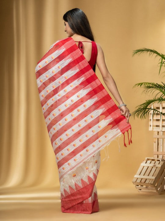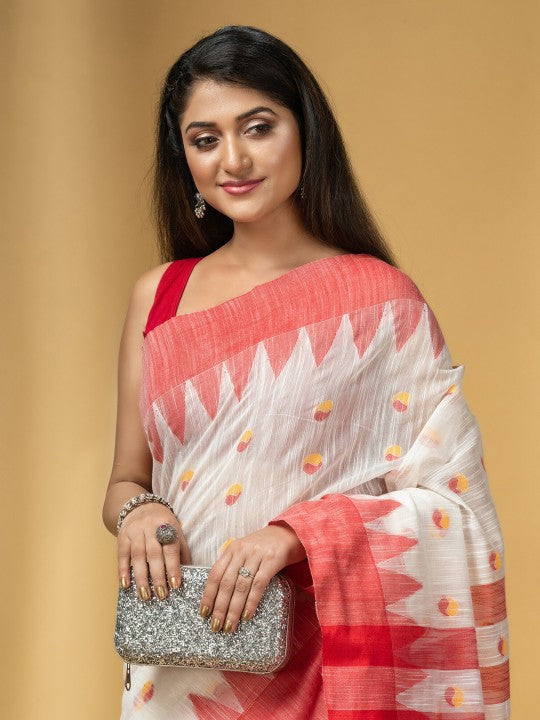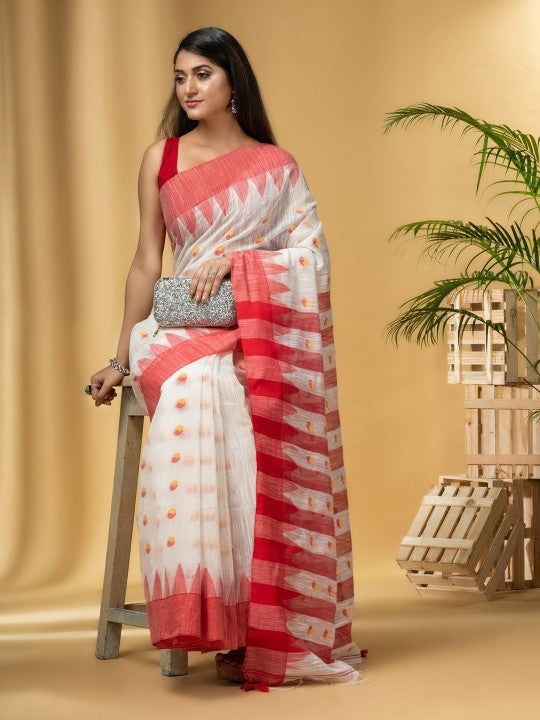 Traditional Bengali Handloom Tant Pure Cotton Saree Bicolor Ball Temple Par Desigined With