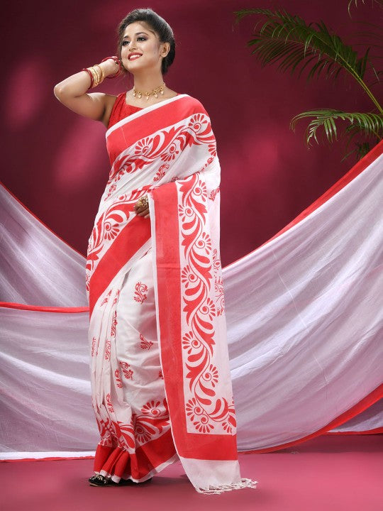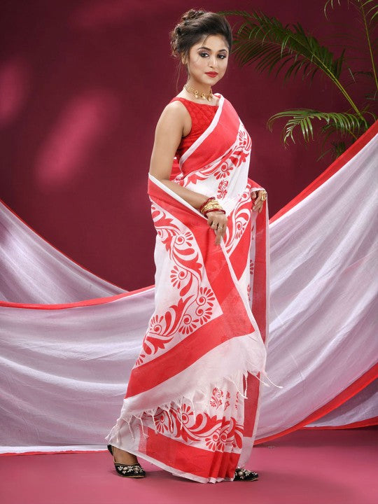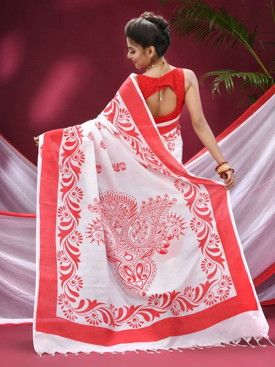 Exquisite Red & White Pure Cotton Saree with Woven Zari Design & Solid Border