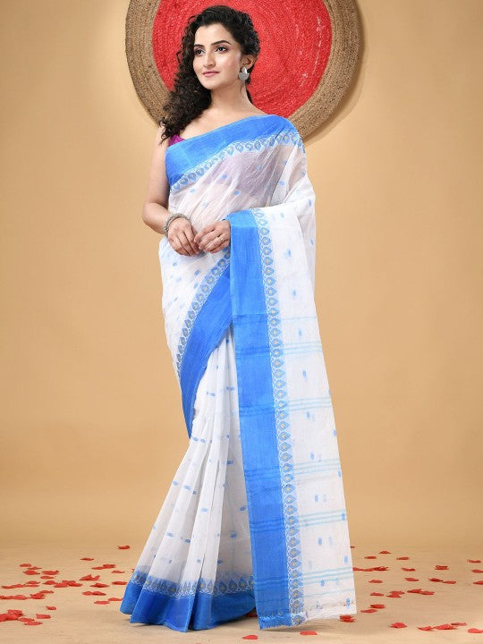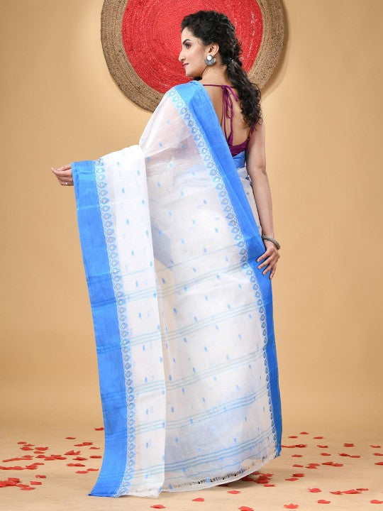 Exquisite White & Blue Pure Cotton Taant Saree with Lotus Bud Woven Design