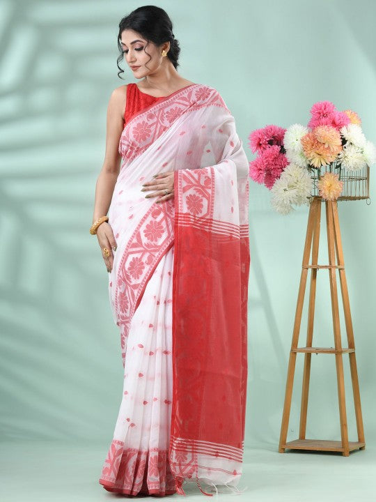 Unleash your inner diva with this exquisite white and red handloom saree, a true masterpiece of textile art. Crafted from a luxurious cotton blend, it features intricate floral woven designs and a stunning border, ensuring you'll turn heads wherever you go. This lightweight and comfortable saree is perfect for any occasion, from festive celebrations to casual gatherings. Its vibrant colors and timeless design make it a versatile addition to your wardrobe, promising effortless elegance and charm. Draping this beauty is pure joy, making you feel fabulous and ready to conquer the world, one graceful step at a time.