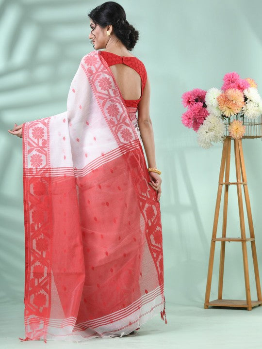 Exquisite White & Red Handloom Saree: Floral Woven Design, Cotton Blend for Women