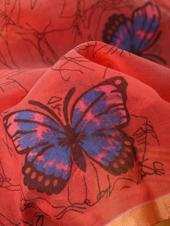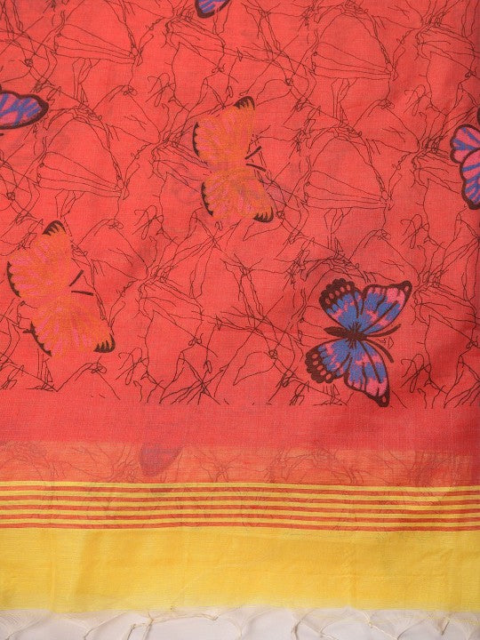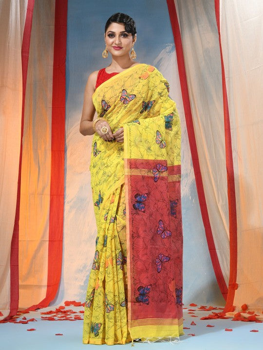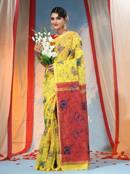 Exquisite Yellow Handloom Saree with Abstract Printed Butterfly Design & Blouse Piece