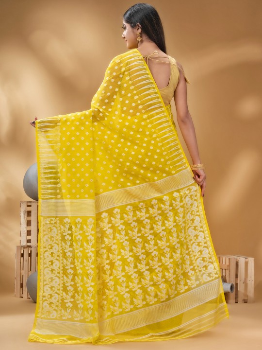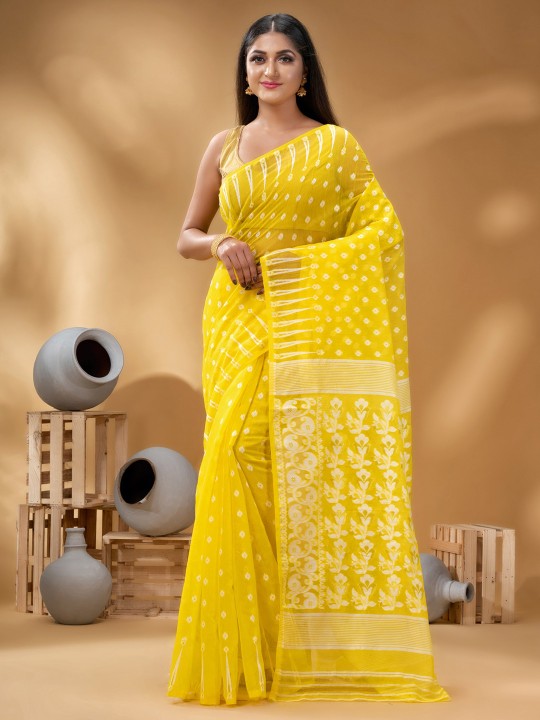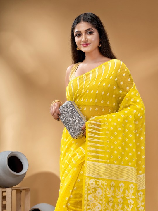 This exquisite yellow and white Jamdani saree, crafted from pure cotton, features an intricate woven design border. The fabric possesses a bright and fresh color, offering a pleasant tactile experience. It maintains a desirable stiffness, ensuring an elegant drape. This saree is designed for ease of pleating and comfortable wear, making it a lightweight and versatile addition to any wardrobe. The traditional Jamdani weaving technique highlights the artisanal skill involved in its creation. Its pure cotton composition ensures breathability and comfort, ideal for various climates. The vibrant color palette and detailed border enhance its aesthetic appeal. This piece is a testament to timeless elegance and traditional craftsmanship. It is suitable for both casual and festive occasions.