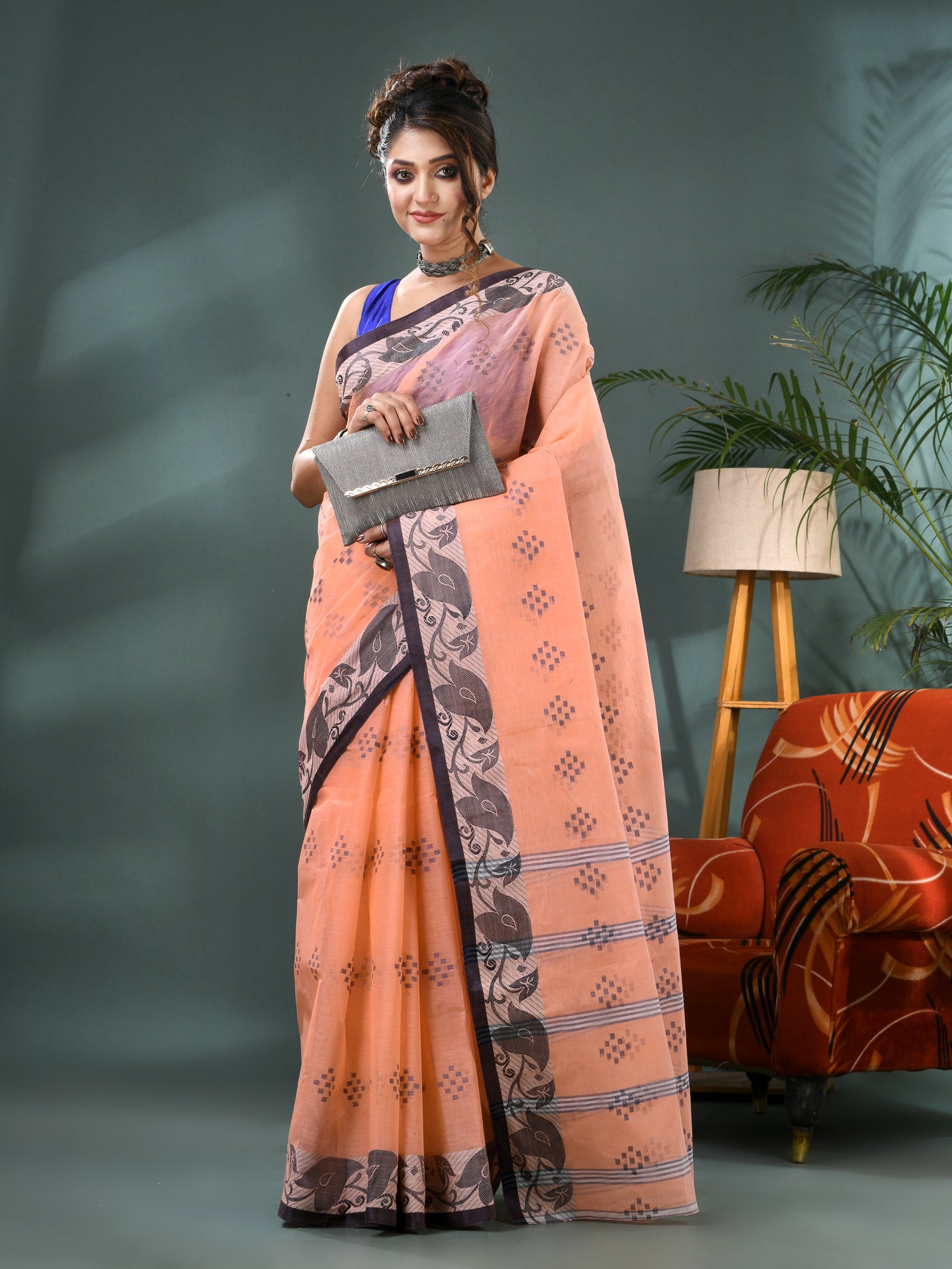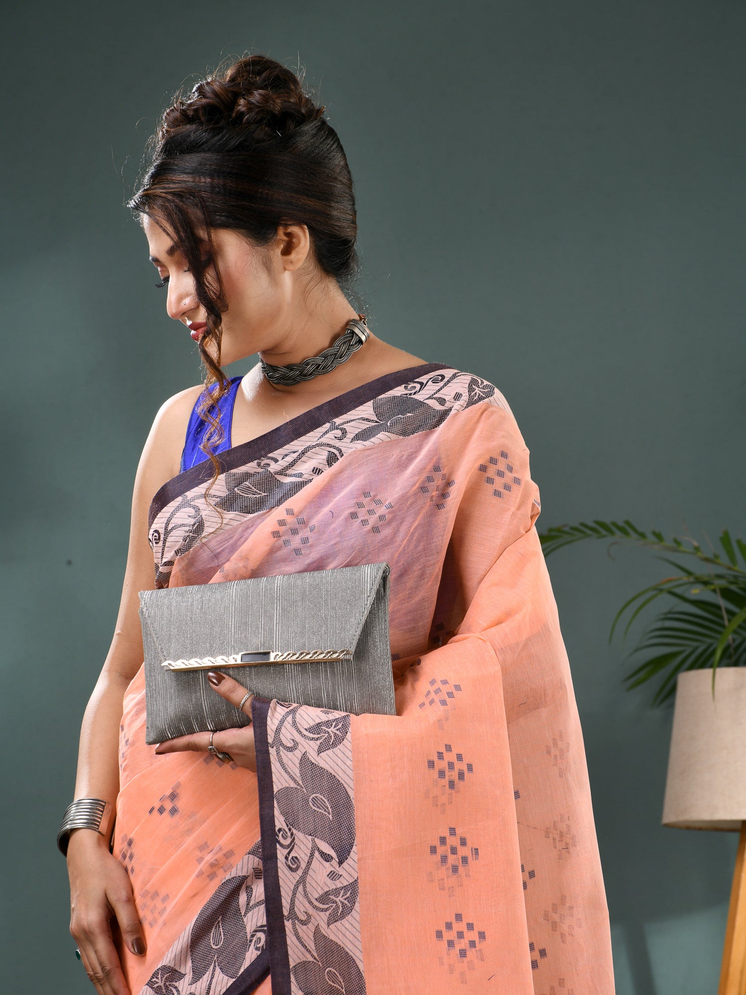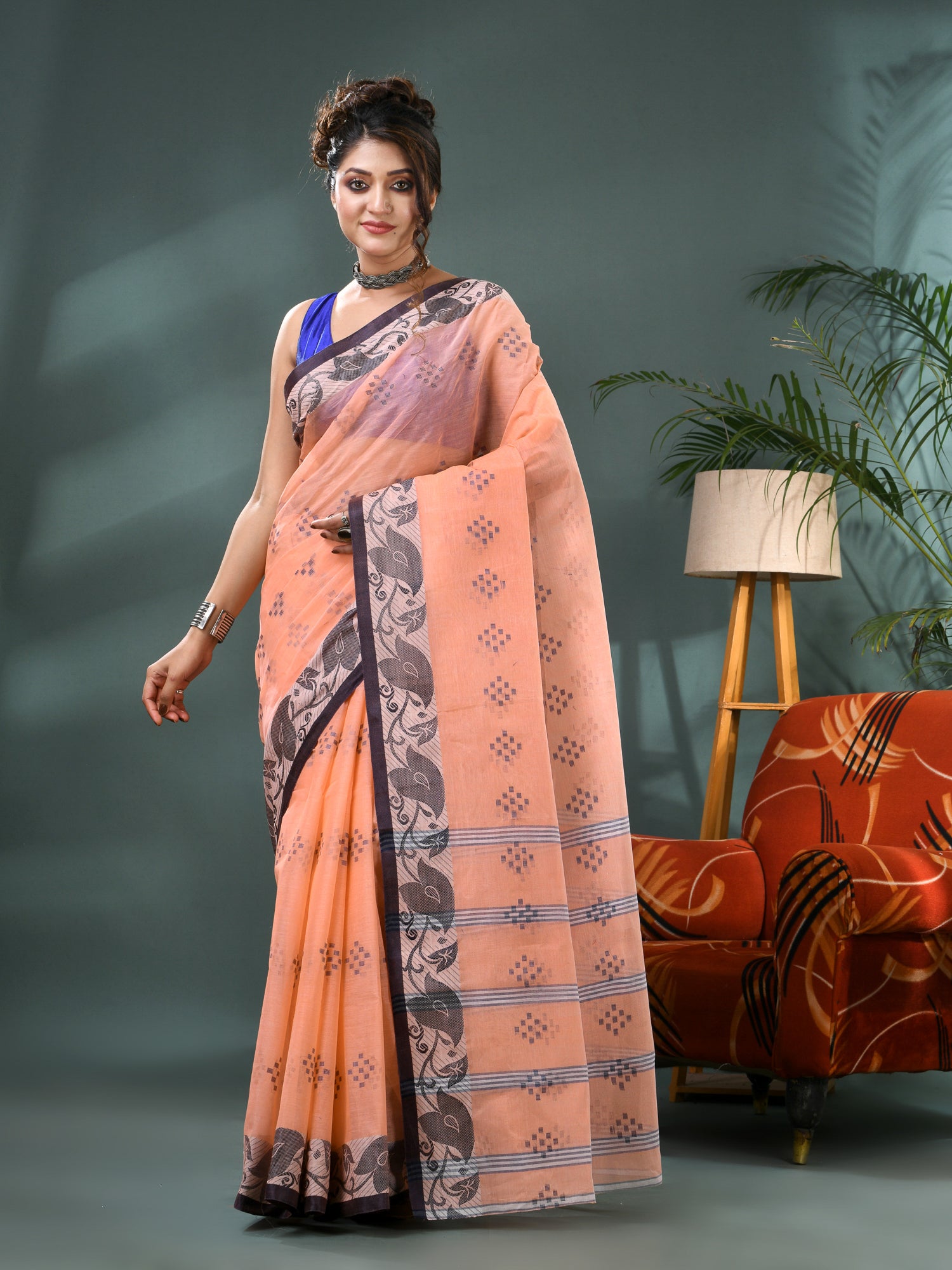 This handwoven tant saree features a plain woven texture with delicate threadwork, reflecting the artistry of Bengal's traditional looms. Available in soothing peach and light firoza color variants, it offers breathable wear for Indian summers and celebrations alike.