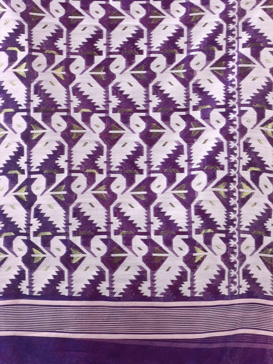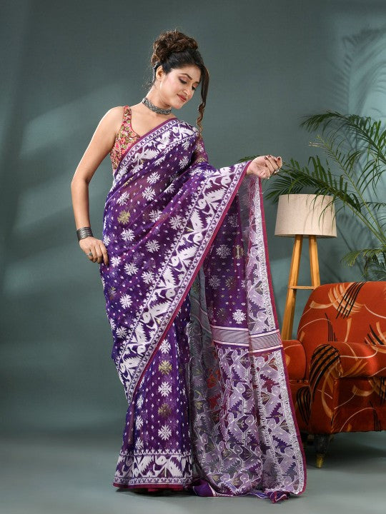 Purple, white and gold-toned jamdani sareeWoven design embroidered saree with borderThe saree comes with an unstitched blouse pieceThe blouse worn by the model might be for modelling purpose only. Check the image of the blouse piece to understand how the actual blouse piece looks like.