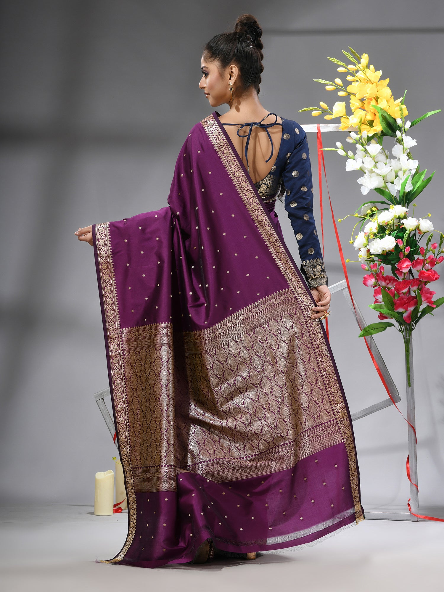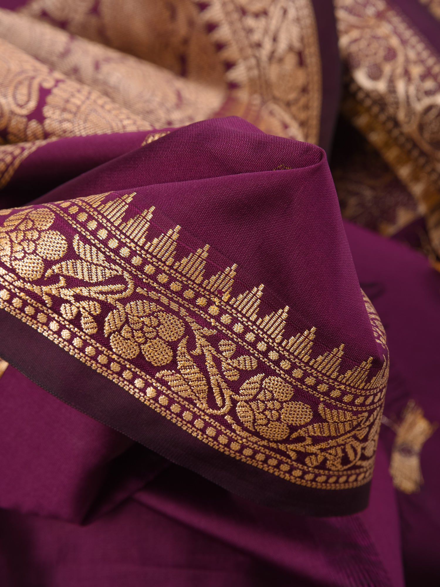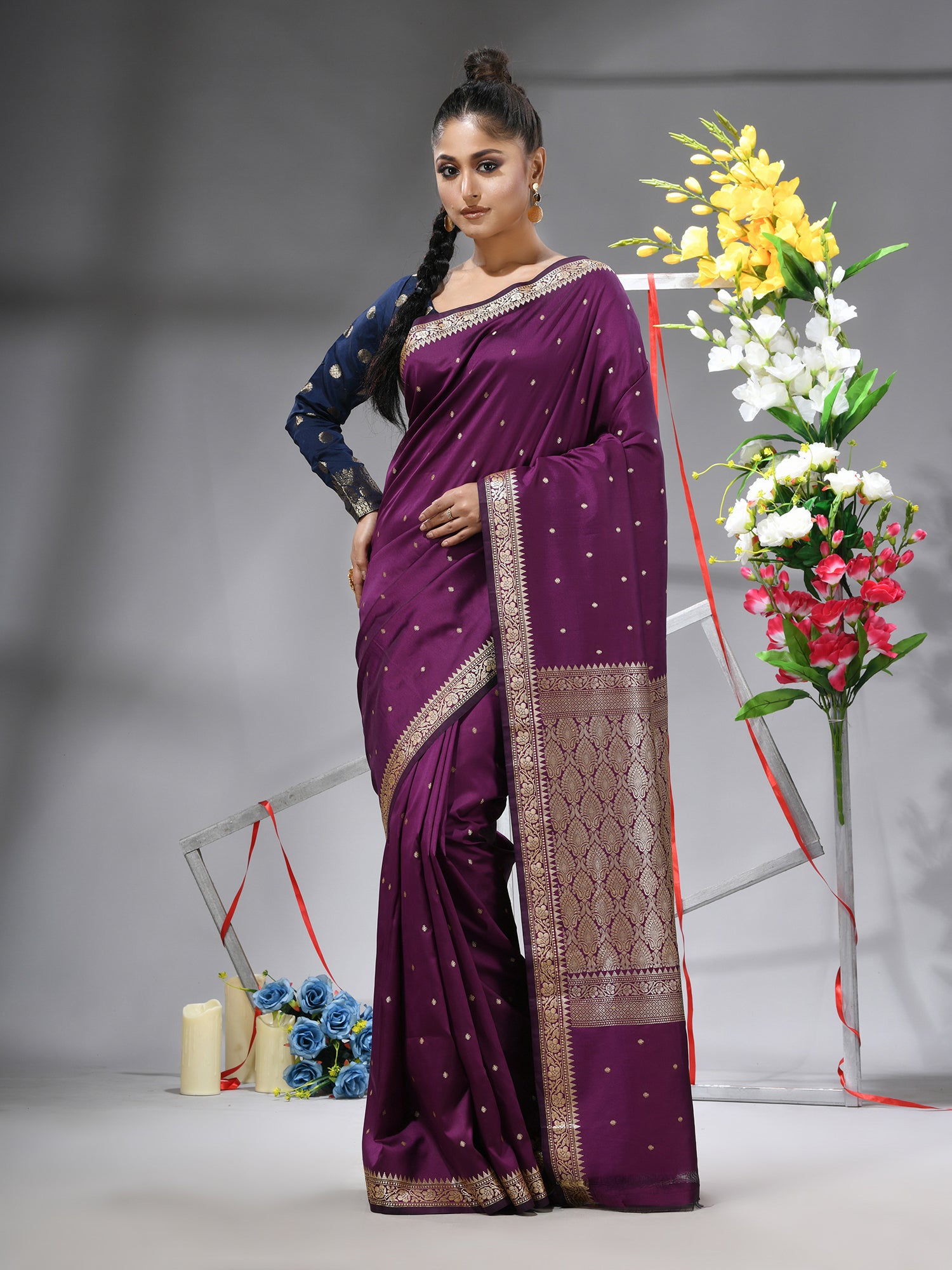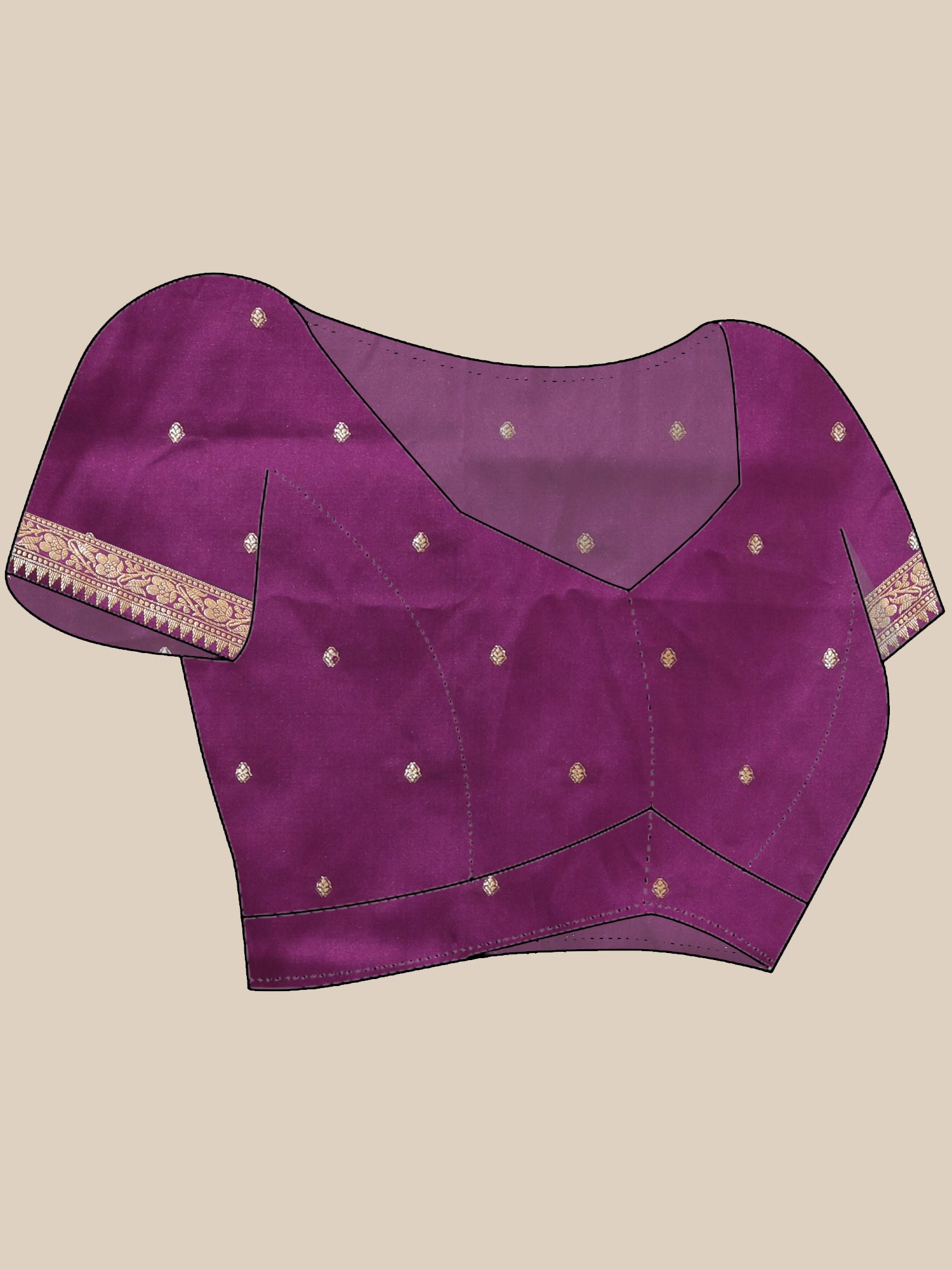 Embrace the regal splendor of the DESH BIDESH MagentaPurple Kanjivaram Kanchipuram Silk Blend Saree. This stunning piece marries the rich, captivating hue of magenta purple with the timeless grandeur of Kanjivaram silk sarees and Kanchipuram sarees. Adorned with delicate silver zari butti work throughout its luxurious jacquard weave, this saree is a masterpiece of traditional artistry. Crafted from a pure silk blend, it offers an elegant drape and an opulent feel. Perfect as a majestic wedding saree, a standout magenta purple saree for special occasions, or a cherished addition to your collection of pure silk sarees. Comes complete with a matching blouse piece.