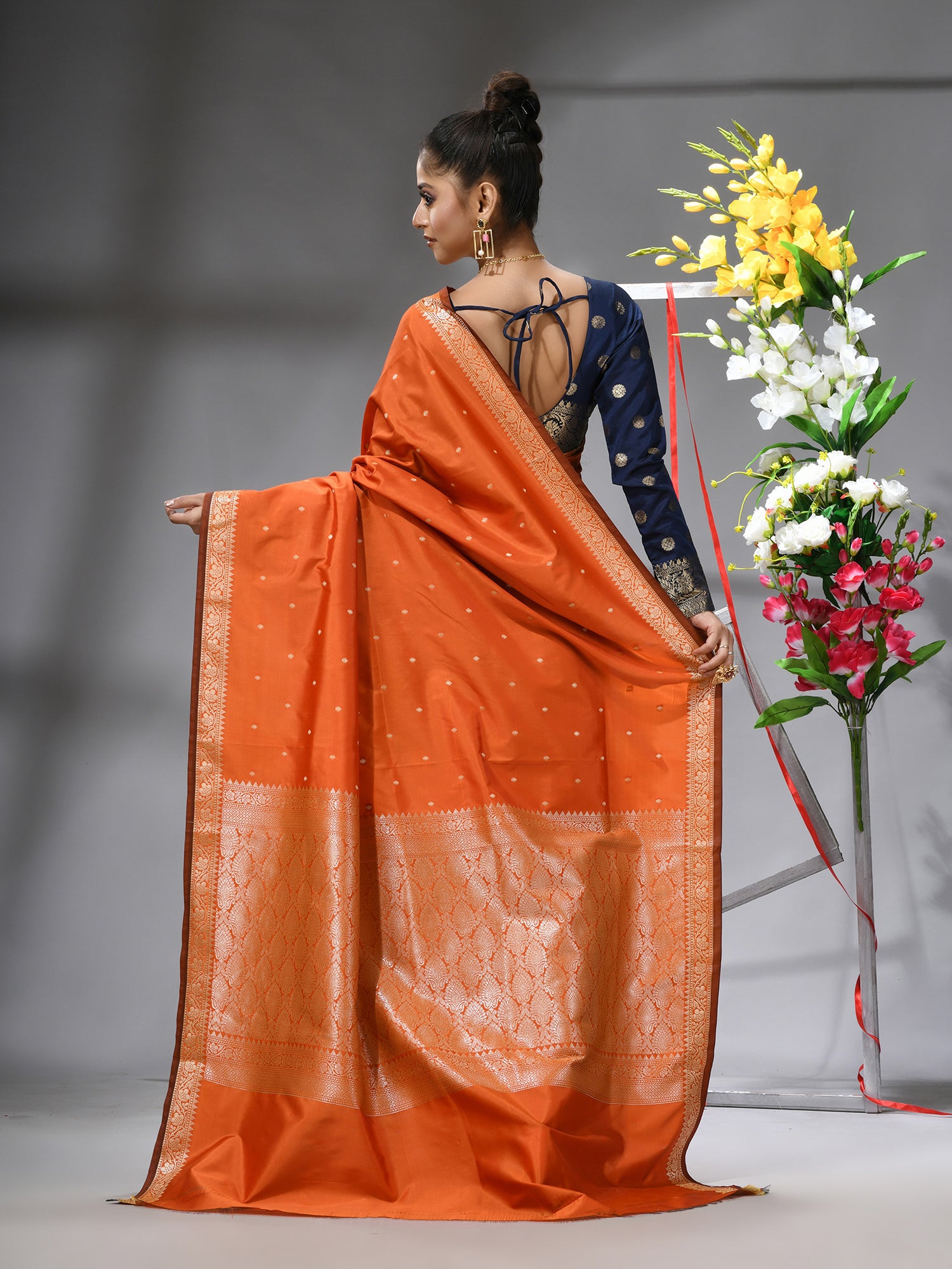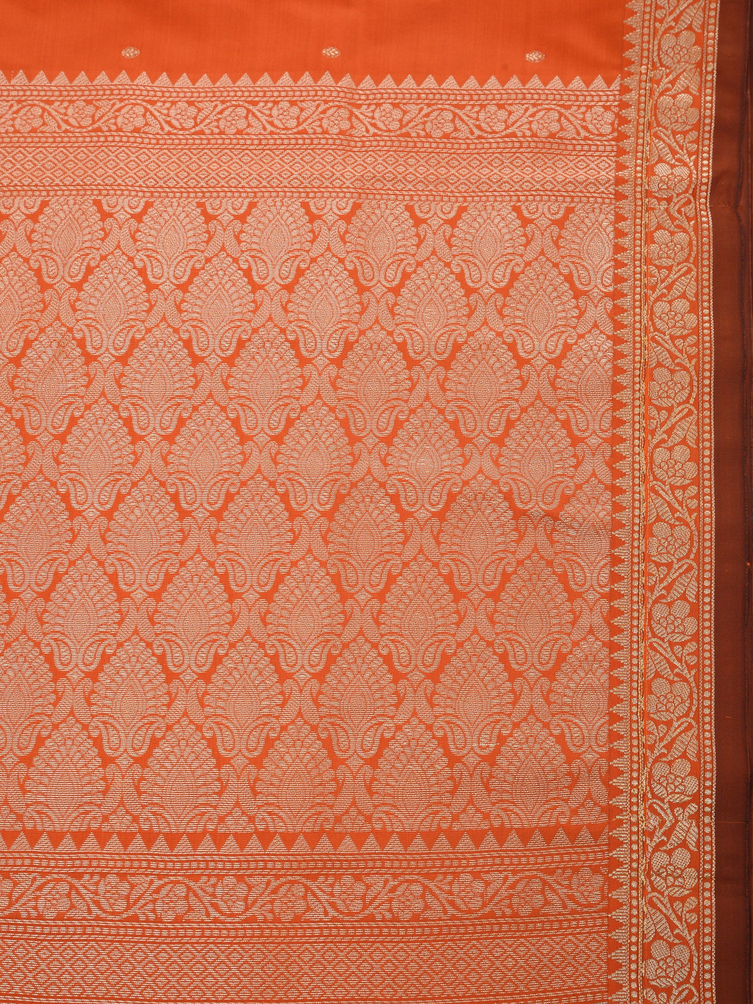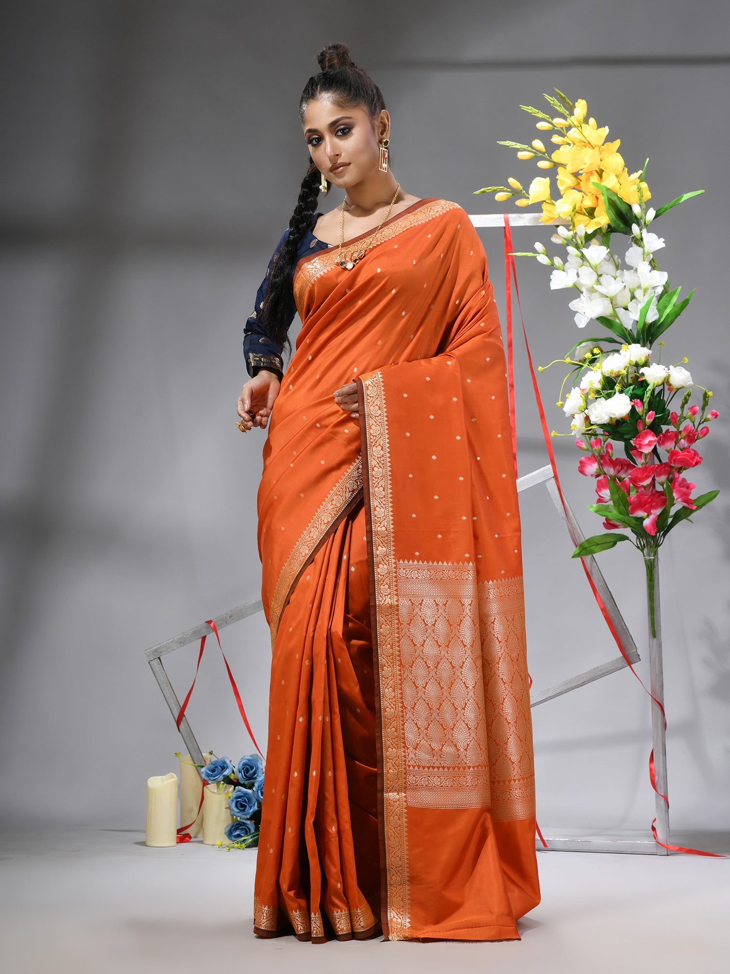 Radiate warmth and joy with the DESH BIDESH Orange Kanjivaram Kanchipuram Silk Blend Saree. This vibrant piece captures the essence of celebration, blending its lively hue with the rich heritage of Kanjivaram silk sarees and Kanchipuram sarees. Adorned with delicate silver zari butti work throughout its luxurious jacquard weave, this saree is a masterpiece of traditional artistry. Crafted from a pure silk blend, it offers an elegant drape and an opulent feel. Perfect as a festive wedding saree, a cheerful orange saree for special occasions, or a treasured addition to your collection of pure silk sarees. Comes complete with a matching blouse piece.