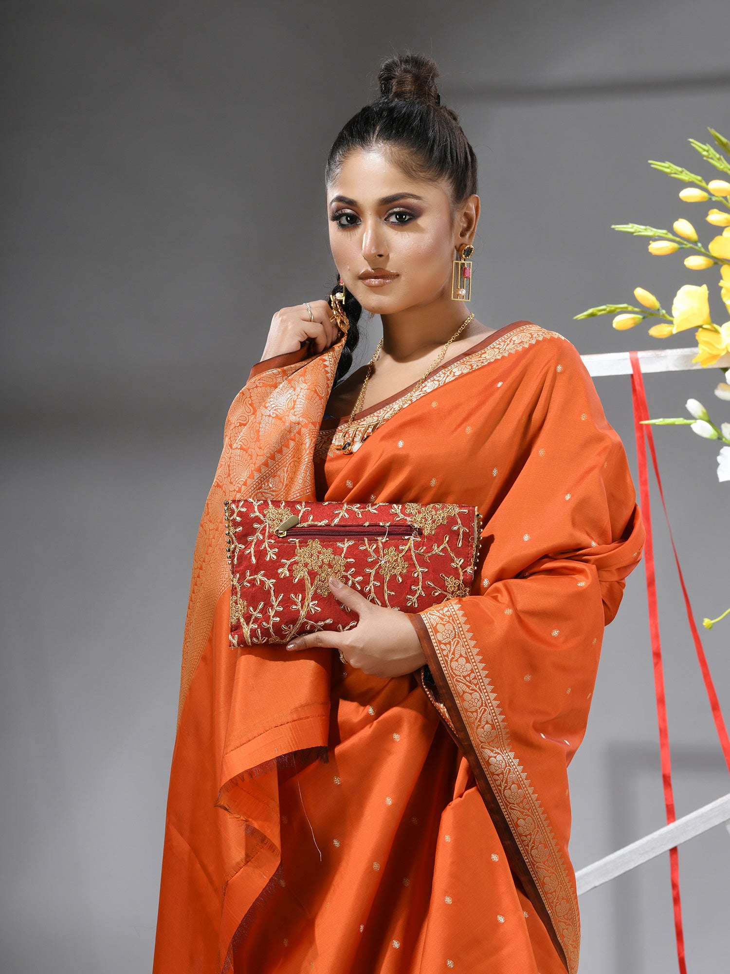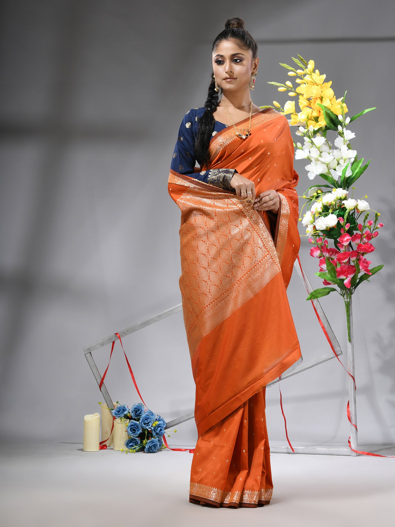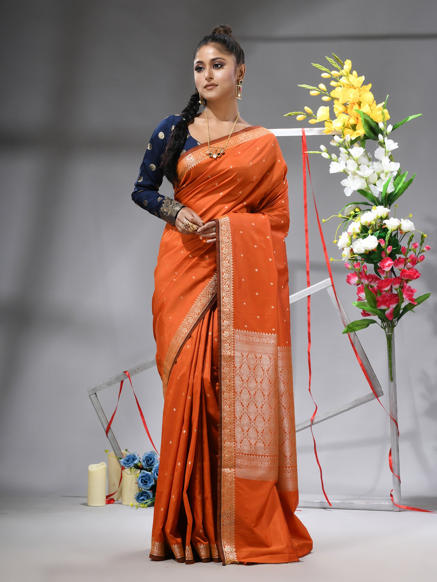 Radiate warmth and joy with the DESH BIDESH Orange Kanjivaram Kanchipuram Silk Blend Saree. This vibrant piece captures the essence of celebration, blending its lively hue with the rich heritage of Kanjivaram silk sarees and Kanchipuram sarees. Adorned with delicate silver zari butti work throughout its luxurious jacquard weave, this saree is a masterpiece of traditional artistry. Crafted from a pure silk blend, it offers an elegant drape and an opulent feel. Perfect as a festive wedding saree, a cheerful orange saree for special occasions, or a treasured addition to your collection of pure silk sarees. Comes complete with a matching blouse piece.