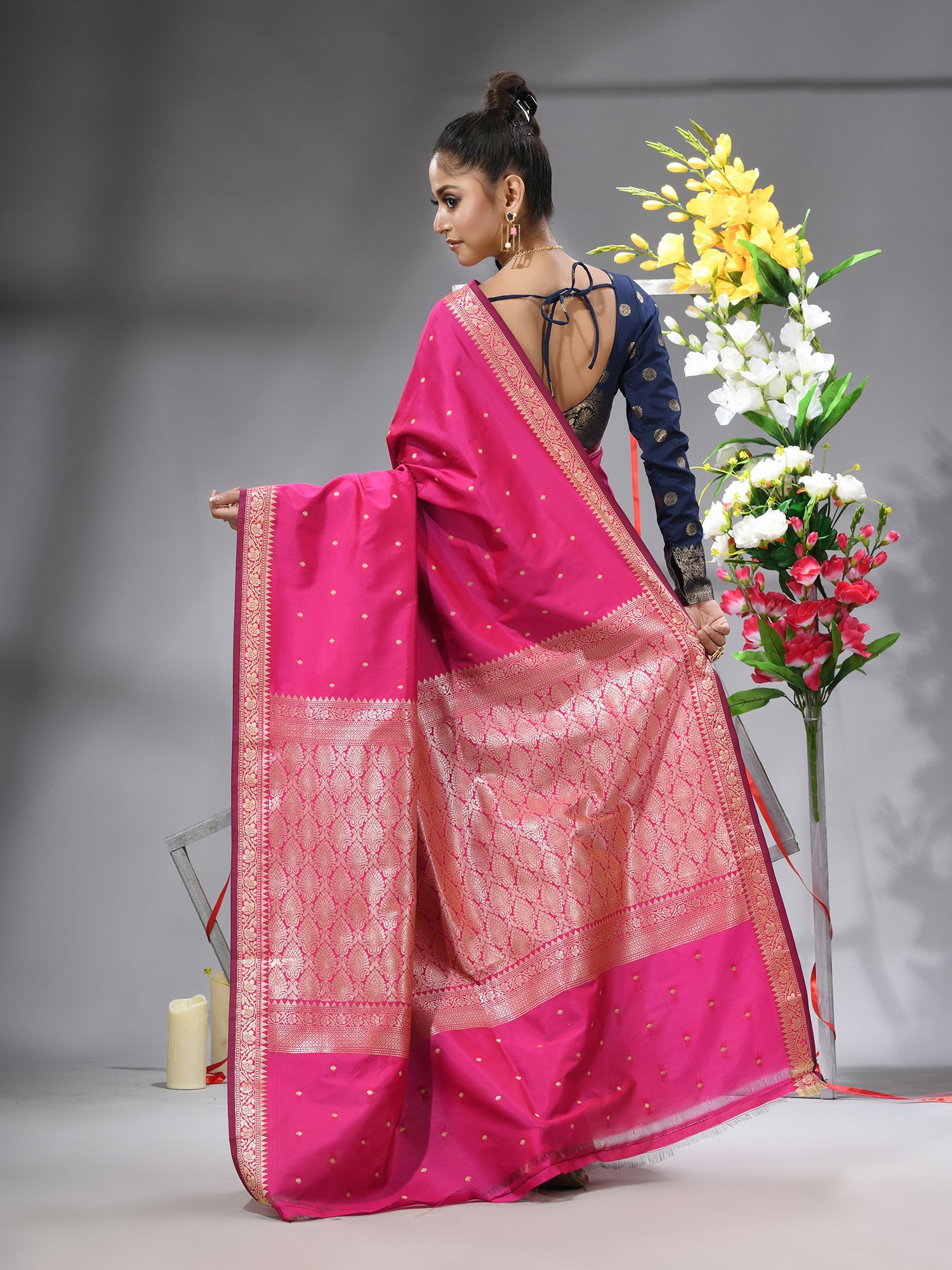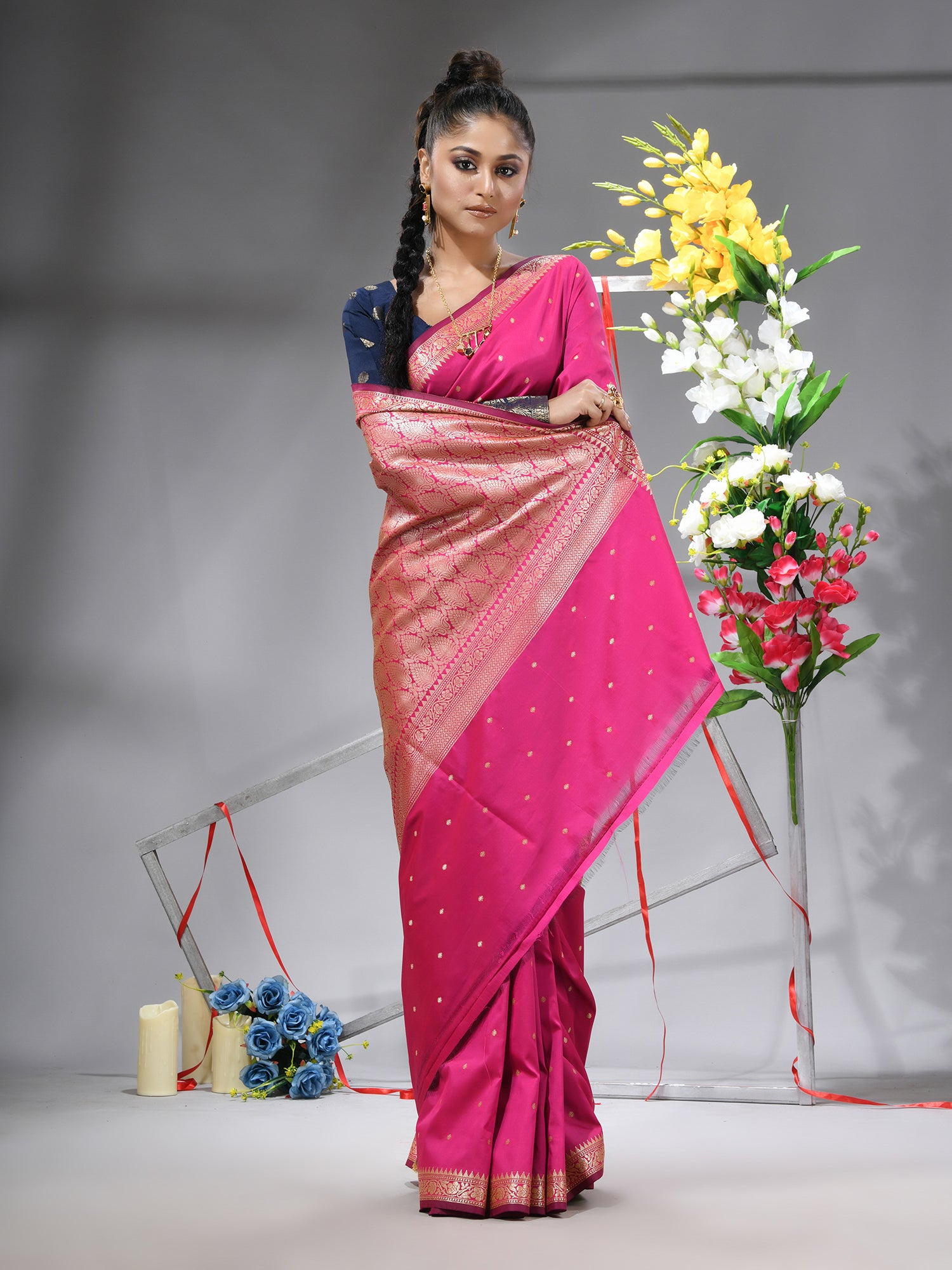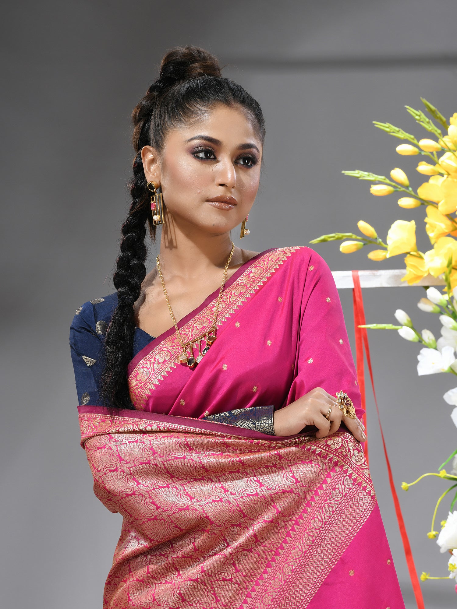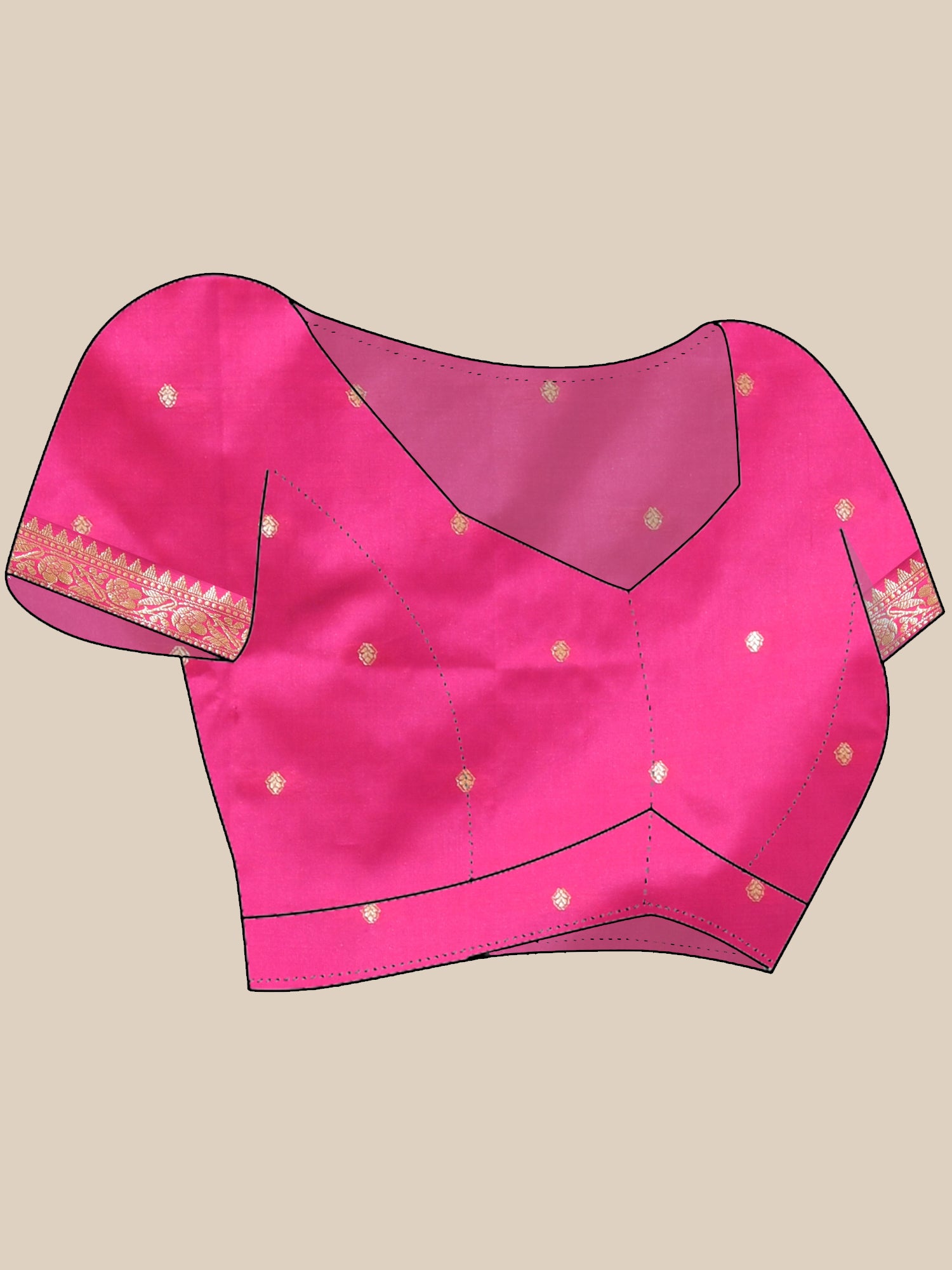 Embrace the enchanting grace of the DESH BIDESH Pink Kanjivaram Kanchipuram Silk Blend Saree. This exquisite pink saree radiates subtle elegance, blending its charming hue with the timeless grandeur of Kanjivaram silk sarees and Kanchipuram sarees. Adorned with delicate silver zari butti work throughout its luxurious jacquard weave, this saree is a masterpiece of traditional artistry. Crafted from a pure silk blend, it offers an elegant drape and an opulent feel. Perfect as a delightful wedding saree, a charming pink kanjivaram saree for special occasions, or a treasured addition to your collection of pure silk sarees. Comes complete with a matching blouse piece.
