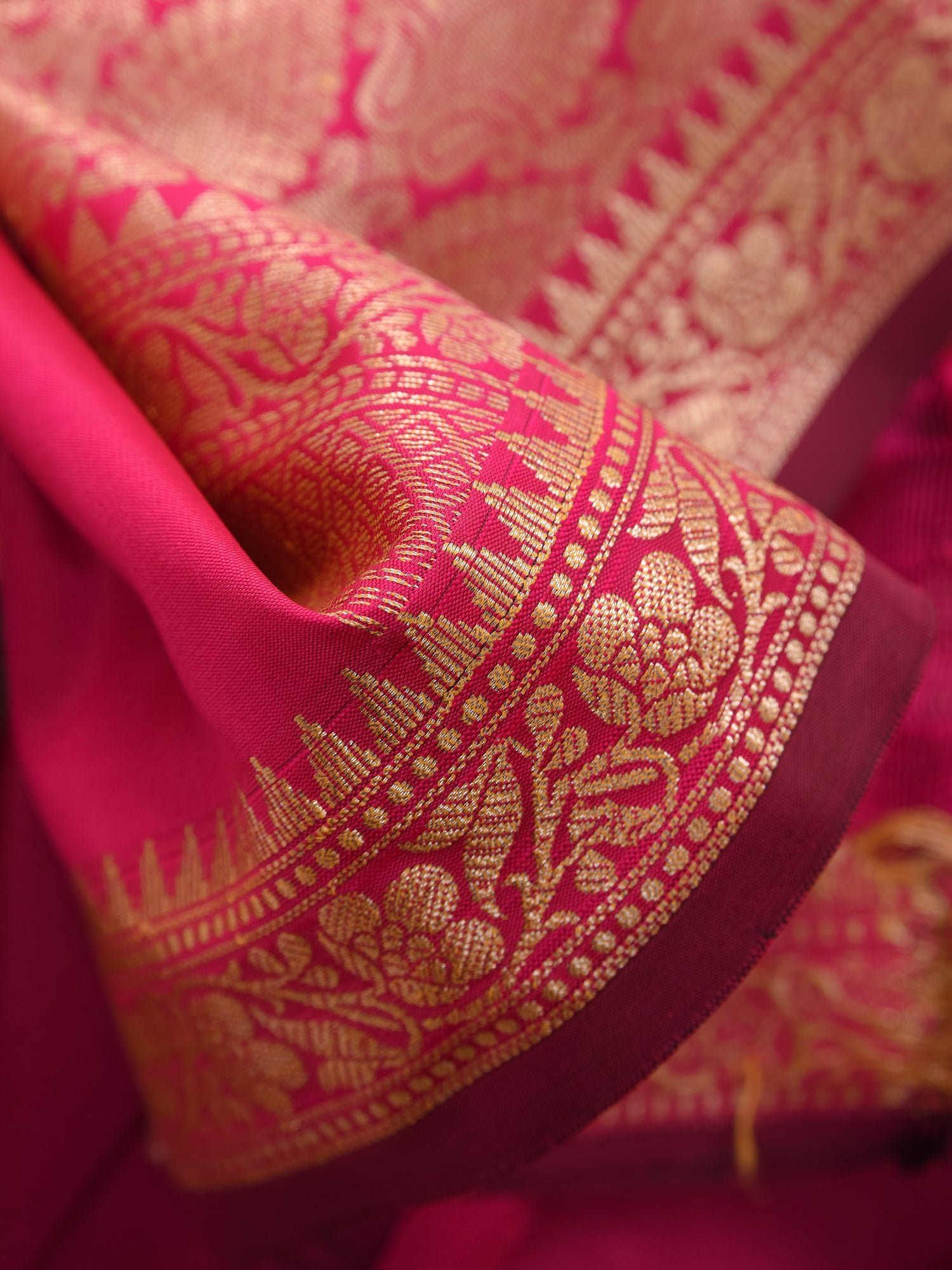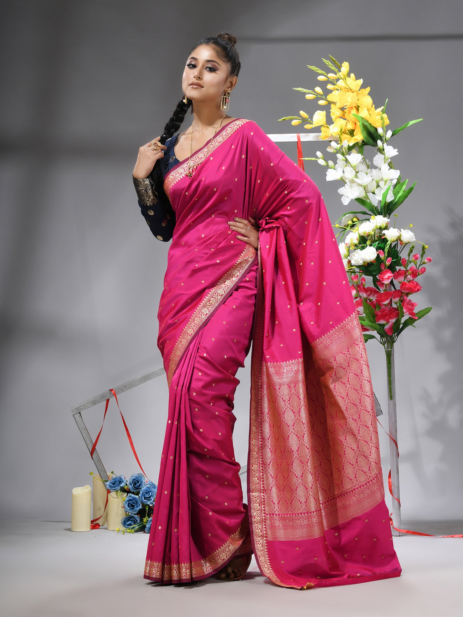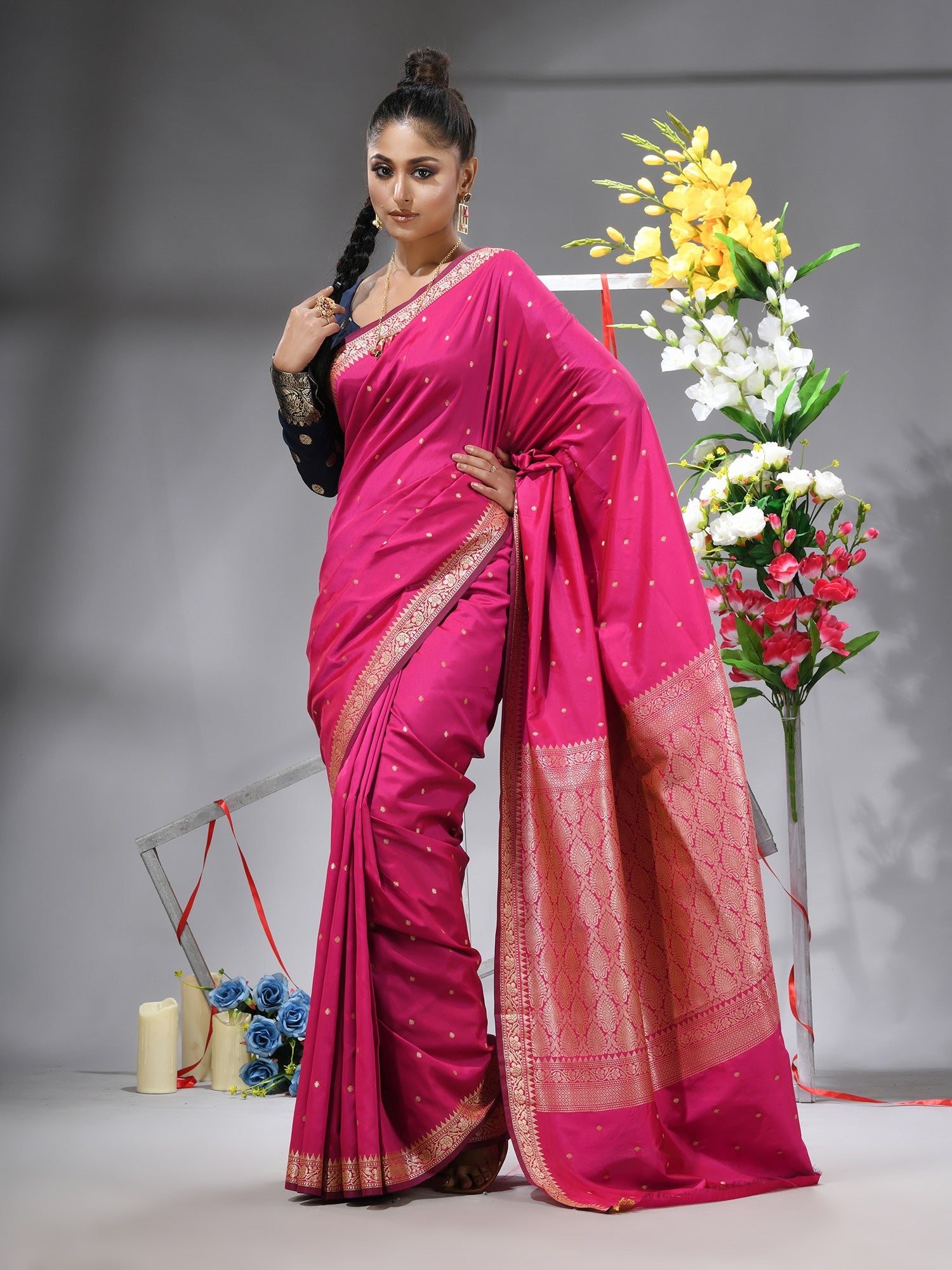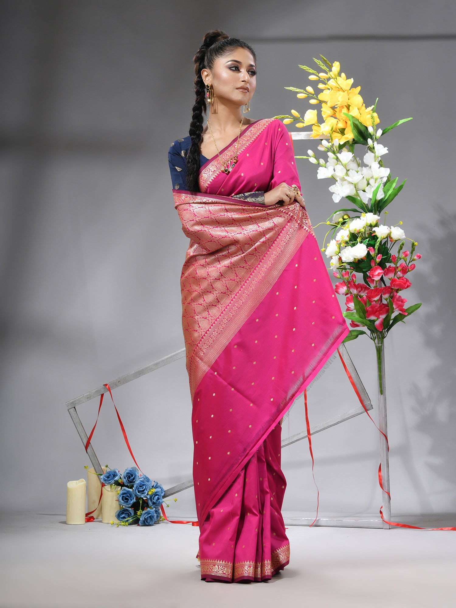 Embrace the enchanting grace of the DESH BIDESH Pink Kanjivaram Kanchipuram Silk Blend Saree. This exquisite pink saree radiates subtle elegance, blending its charming hue with the timeless grandeur of Kanjivaram silk sarees and Kanchipuram sarees. Adorned with delicate silver zari butti work throughout its luxurious jacquard weave, this saree is a masterpiece of traditional artistry. Crafted from a pure silk blend, it offers an elegant drape and an opulent feel. Perfect as a delightful wedding saree, a charming pink kanjivaram saree for special occasions, or a treasured addition to your collection of pure silk sarees. Comes complete with a matching blouse piece.