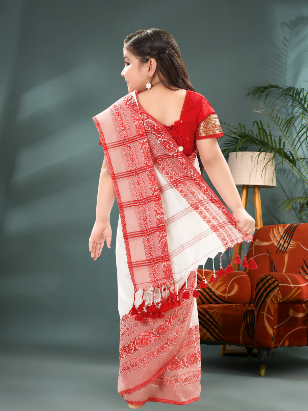 This beautiful ethnic saree features intricate zari weaving along the borders, giving it an elegant and rich finish. Available in vibrant Red-White and Red-Yellow combinations, it reflects classic Bengali culture while being comfortable for children.