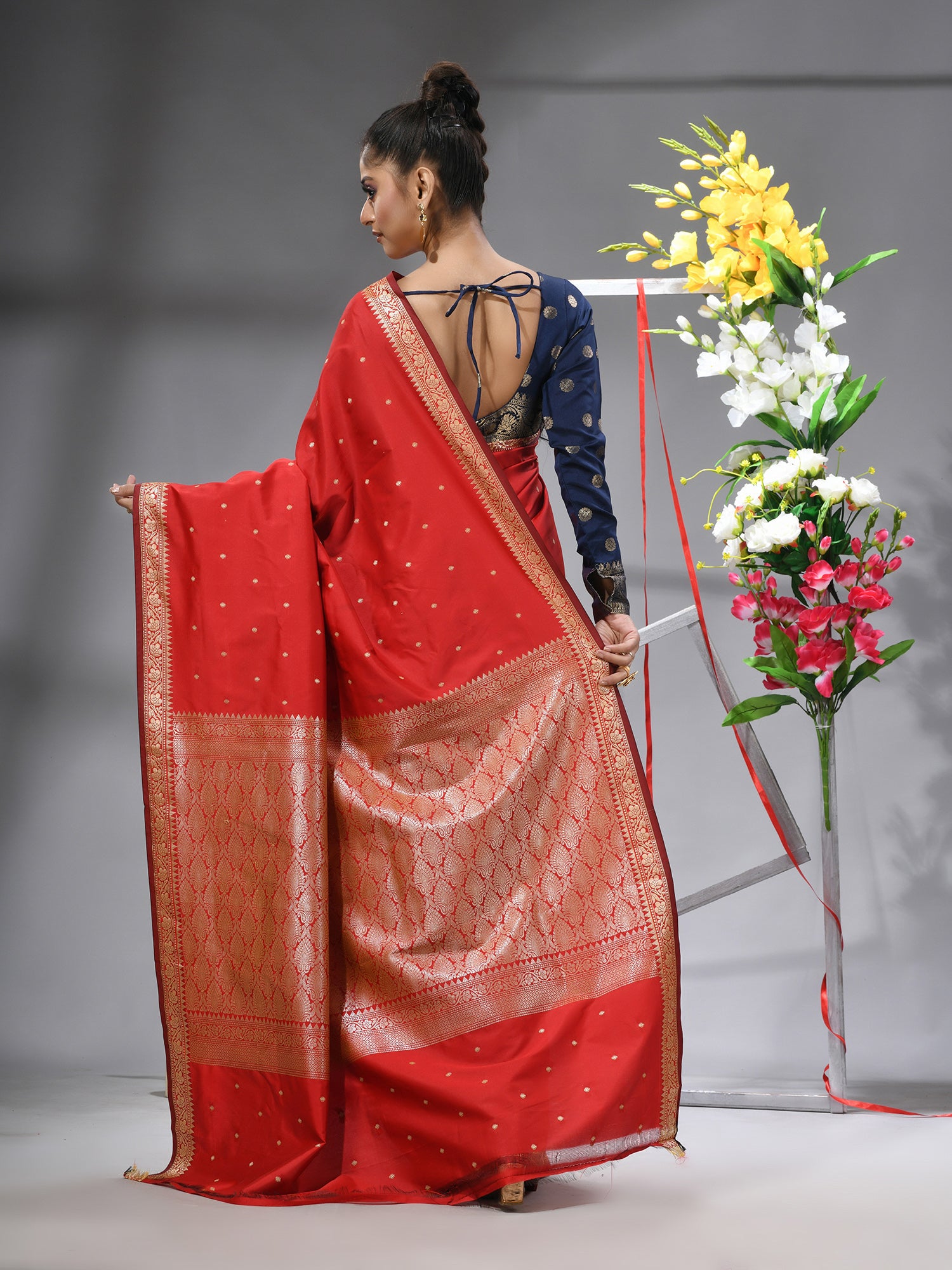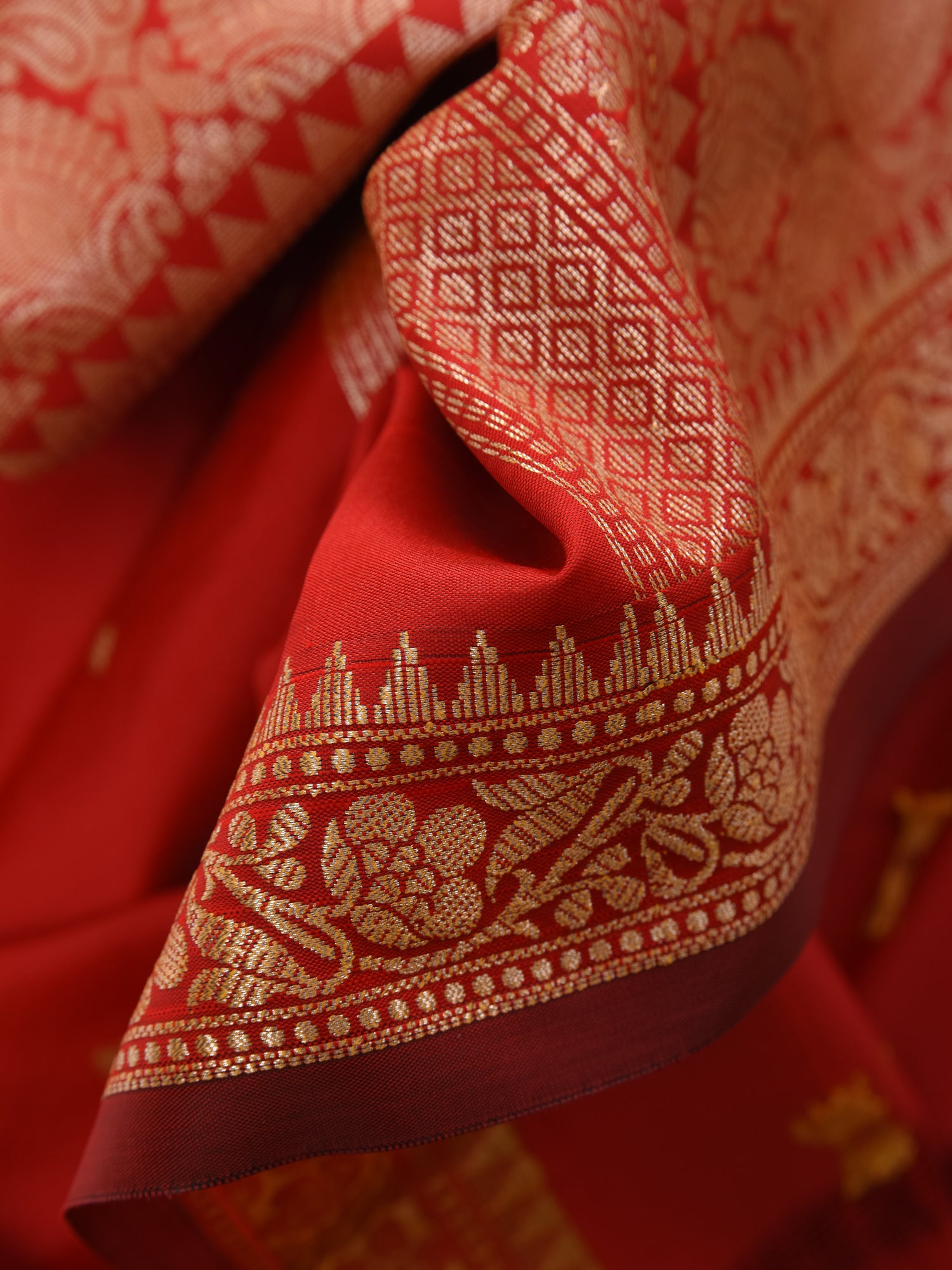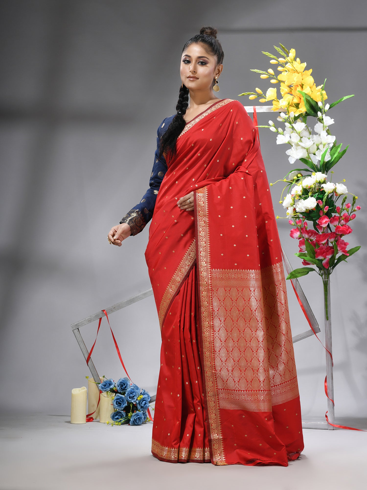 Make a striking statement with the DESH BIDESH Red Kanjivaram Kanchipuram Silk Blend Saree, a vibrant symbol of tradition and grandeur. This exquisite red saree is a celebration of the rich heritage of Kanjivaram silk sarees and Kanchipuram sarees, beautifully adorned with intricate silver zari butti work throughout its luxurious jacquard weave. Crafted from a pure silk blend, it offers a magnificent drape and an opulent feel, perfect for a red wedding saree or any grand occasion. Embrace the timeless allure of pure silk saree and the regal elegance of banarasi silk saree with this captivating piece. Comes complete with a matching blouse piece, making it an ideal choice for a stunning saree for wedding.