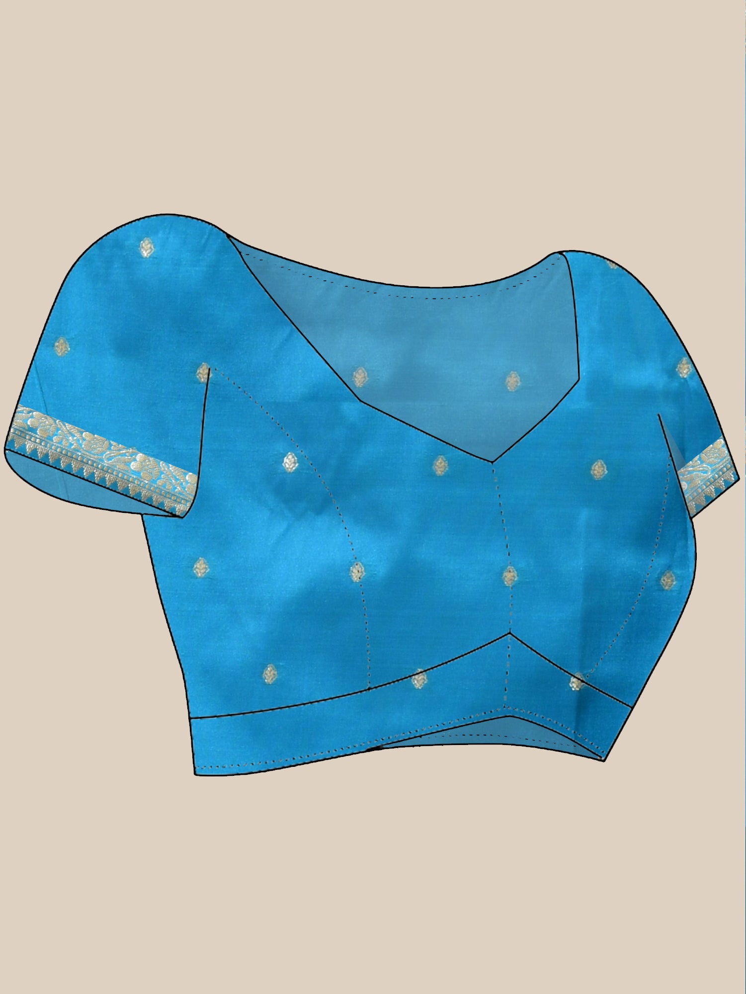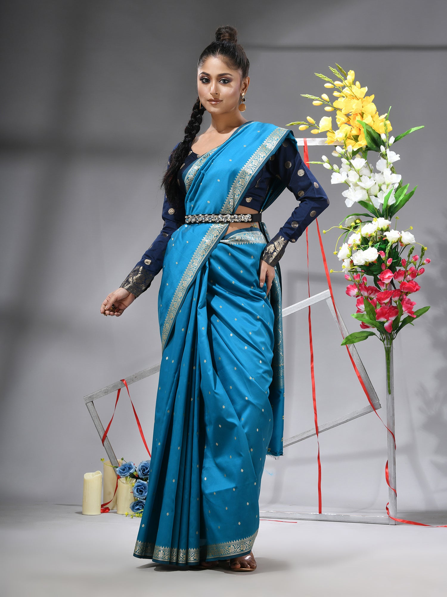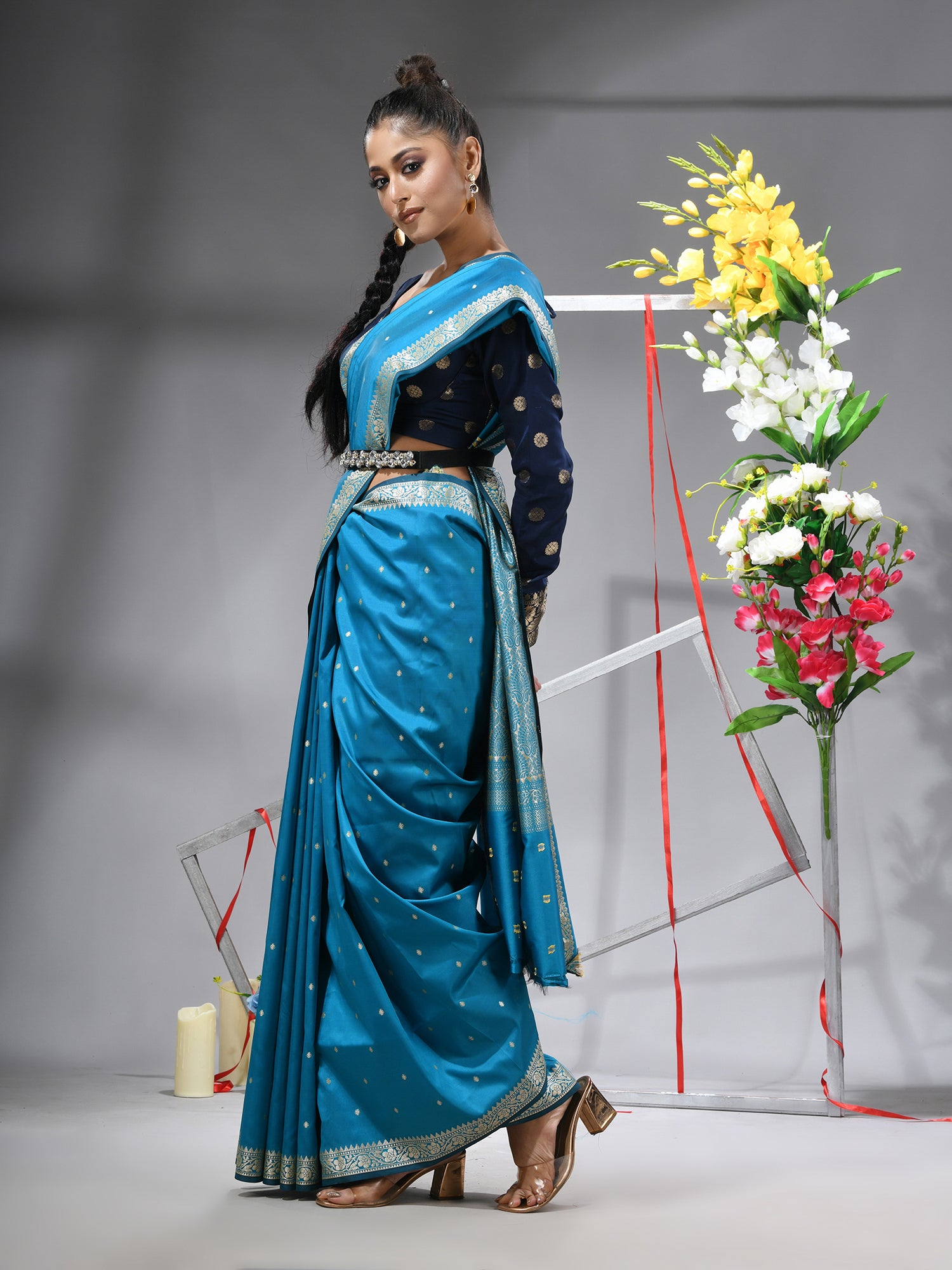 Explore deeply the tranquil beauty of the DESH BIDESH Sea Blue Kanjivaram Kanchipuram Silk Blend Saree. This exquisite piece captures the serene essence of the ocean with the rich heritage of Kanjivaram silk sarees and Kanchipuram sarees. Adorned with delicate silver zari butti work throughout its luxurious jacquard weave, this saree is a masterpiece of traditional artistry. Crafted from a pure silk blend, it offers an elegant drape and an opulent feel. Perfect as a unique wedding saree, a stunning sea blue saree for special occasions, or a treasured addition to your collection of pure silk sarees. Comes complete with a matching blouse piece.