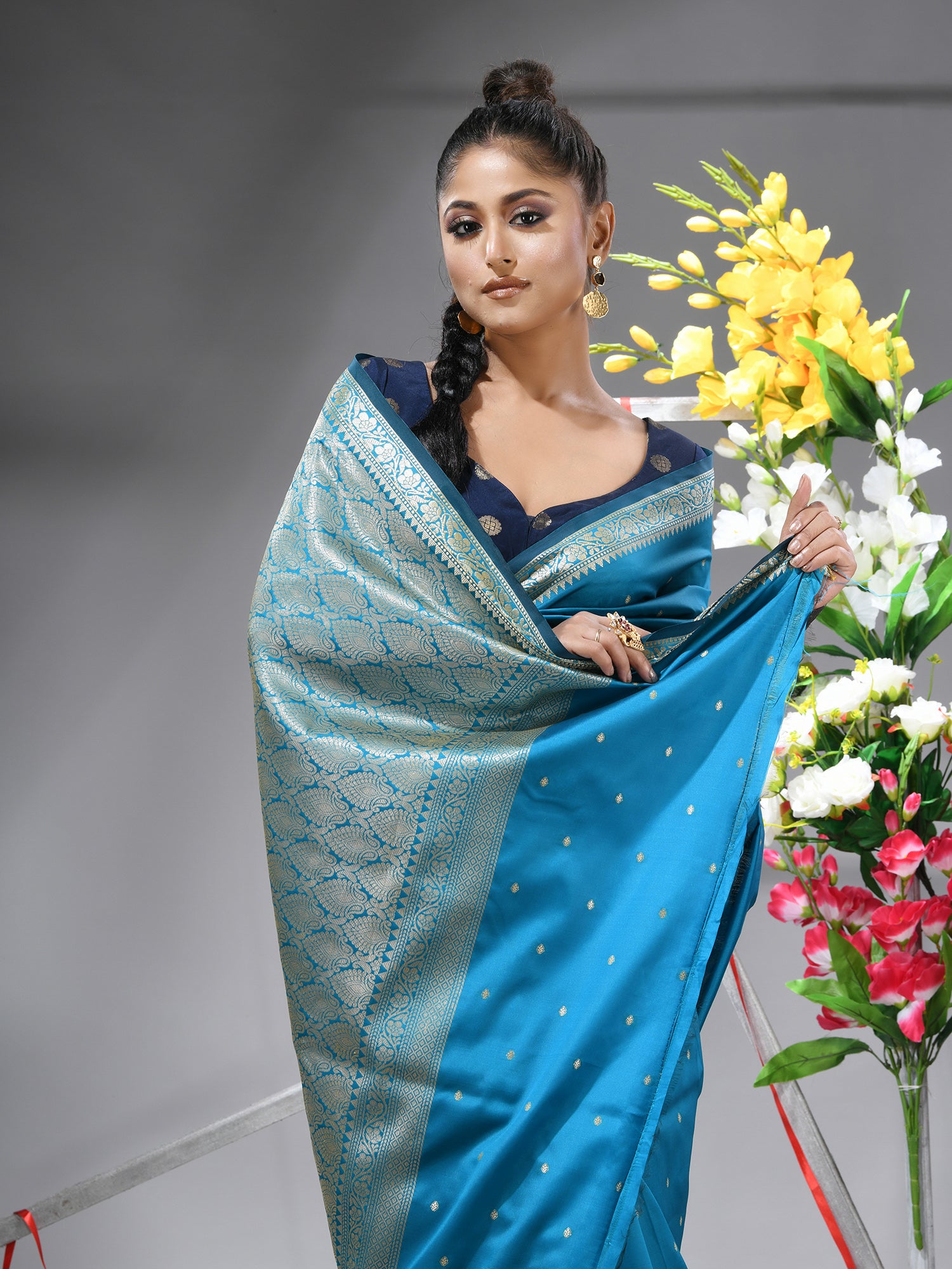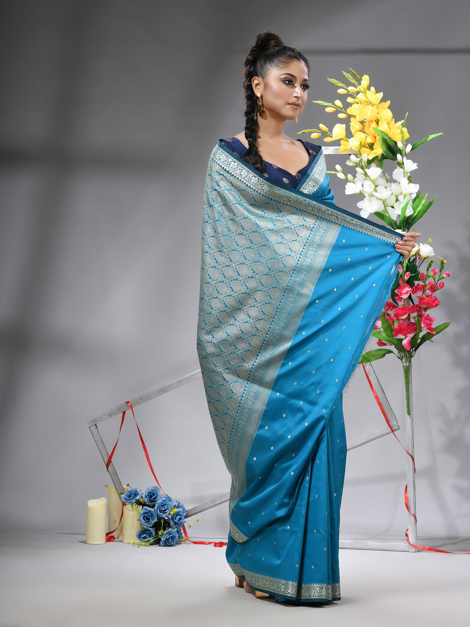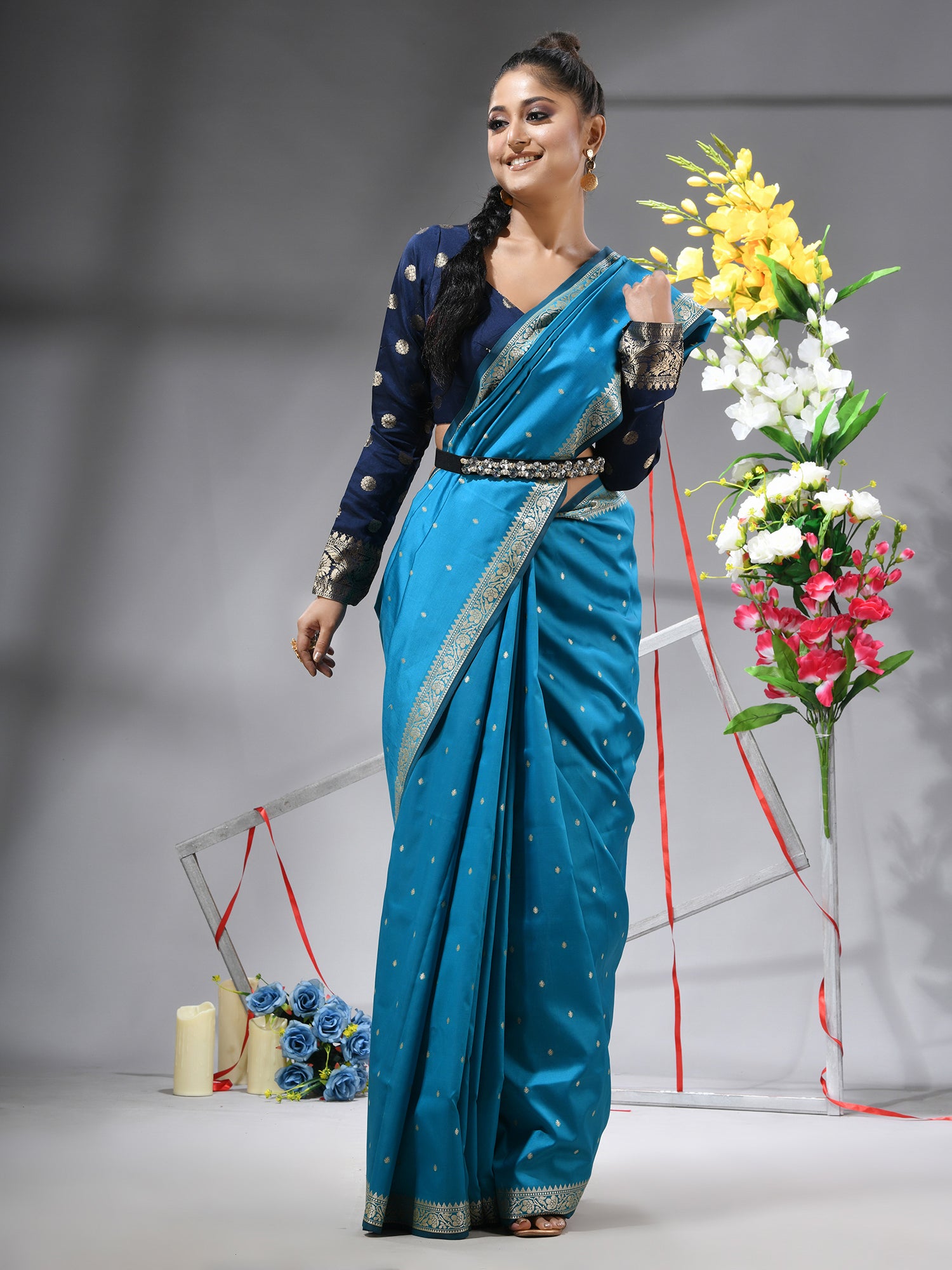 Explore deeply the tranquil beauty of the DESH BIDESH Sea Blue Kanjivaram Kanchipuram Silk Blend Saree. This exquisite piece captures the serene essence of the ocean with the rich heritage of Kanjivaram silk sarees and Kanchipuram sarees. Adorned with delicate silver zari butti work throughout its luxurious jacquard weave, this saree is a masterpiece of traditional artistry. Crafted from a pure silk blend, it offers an elegant drape and an opulent feel. Perfect as a unique wedding saree, a stunning sea blue saree for special occasions, or a treasured addition to your collection of pure silk sarees. Comes complete with a matching blouse piece.