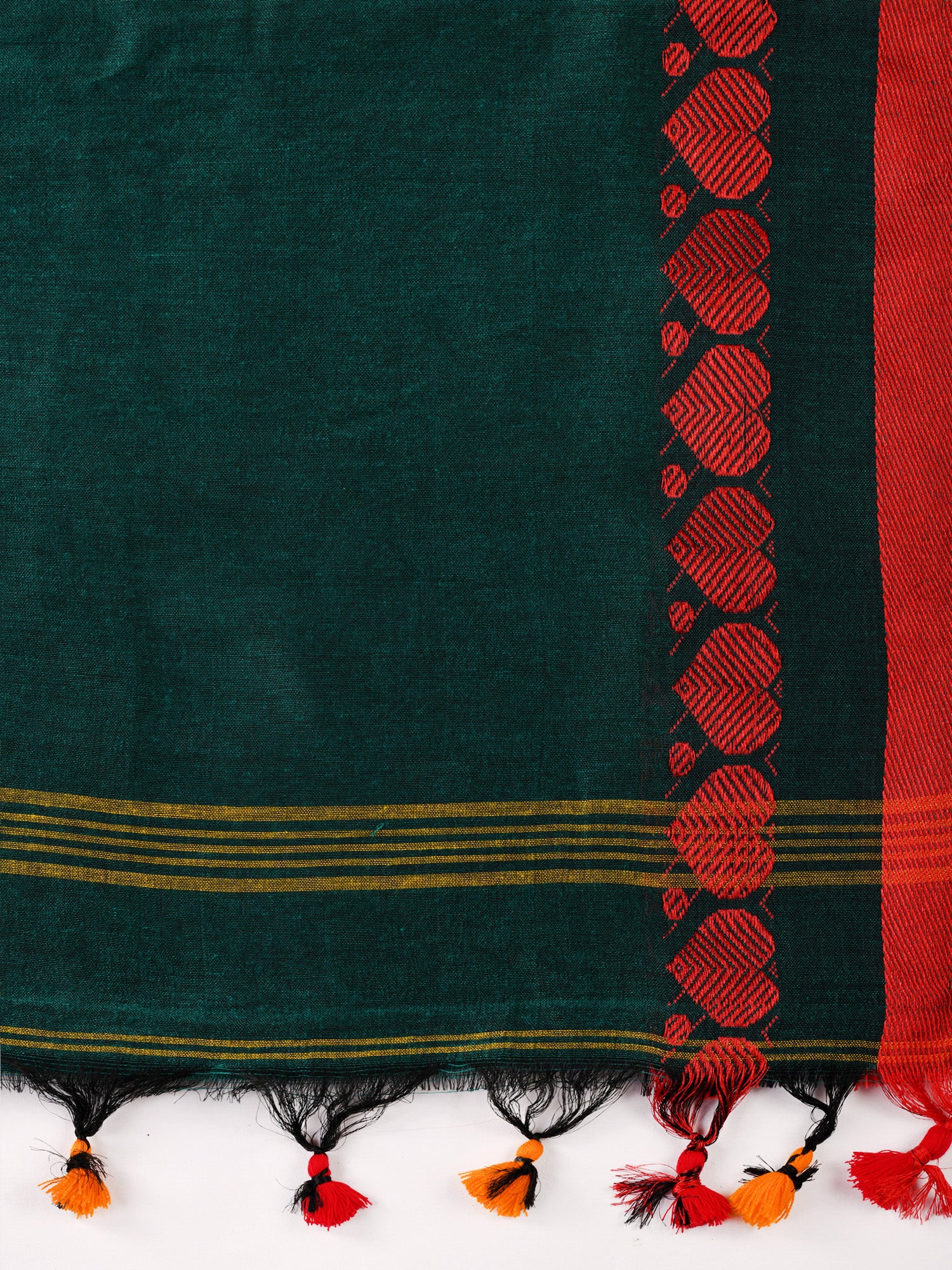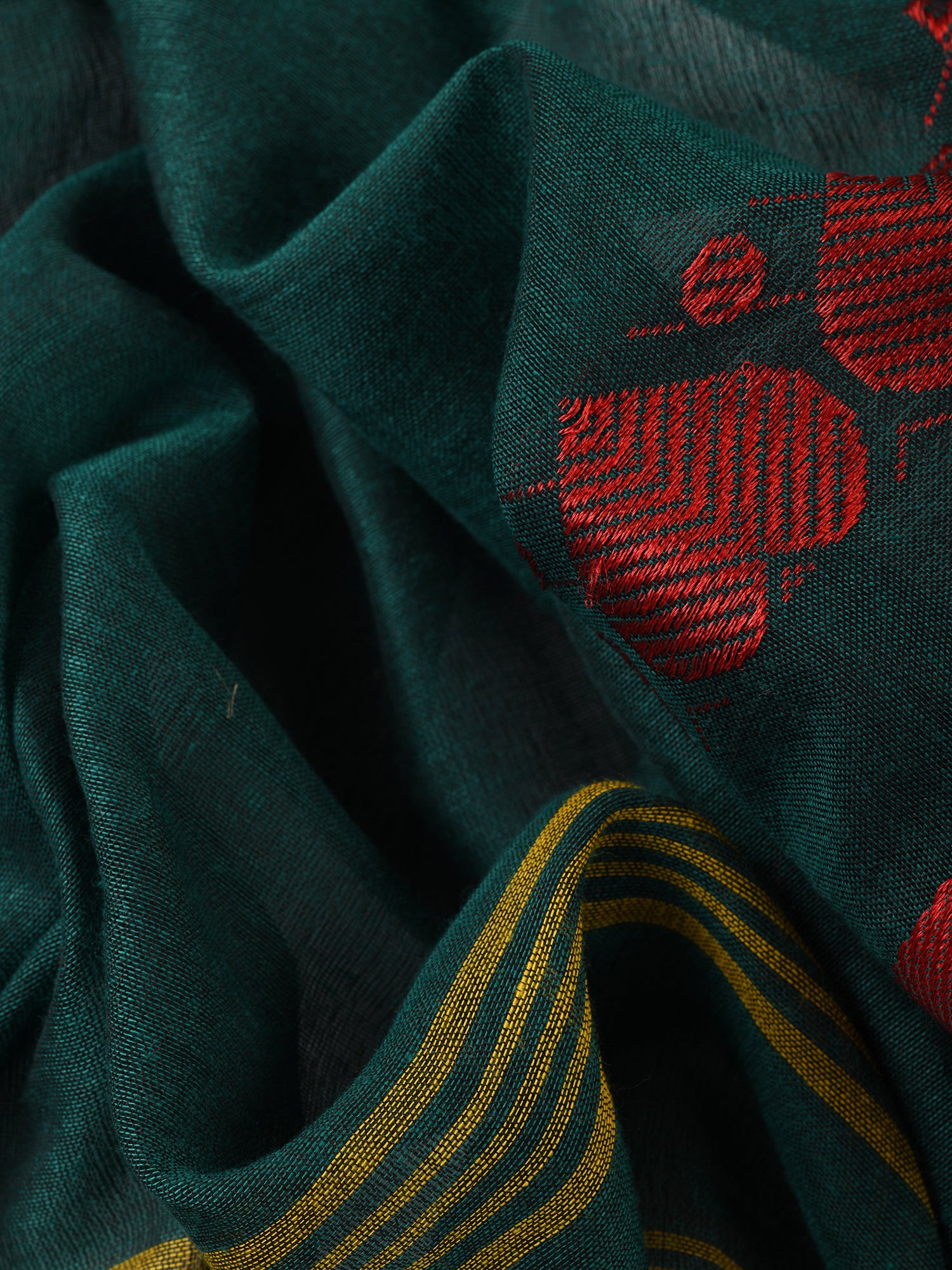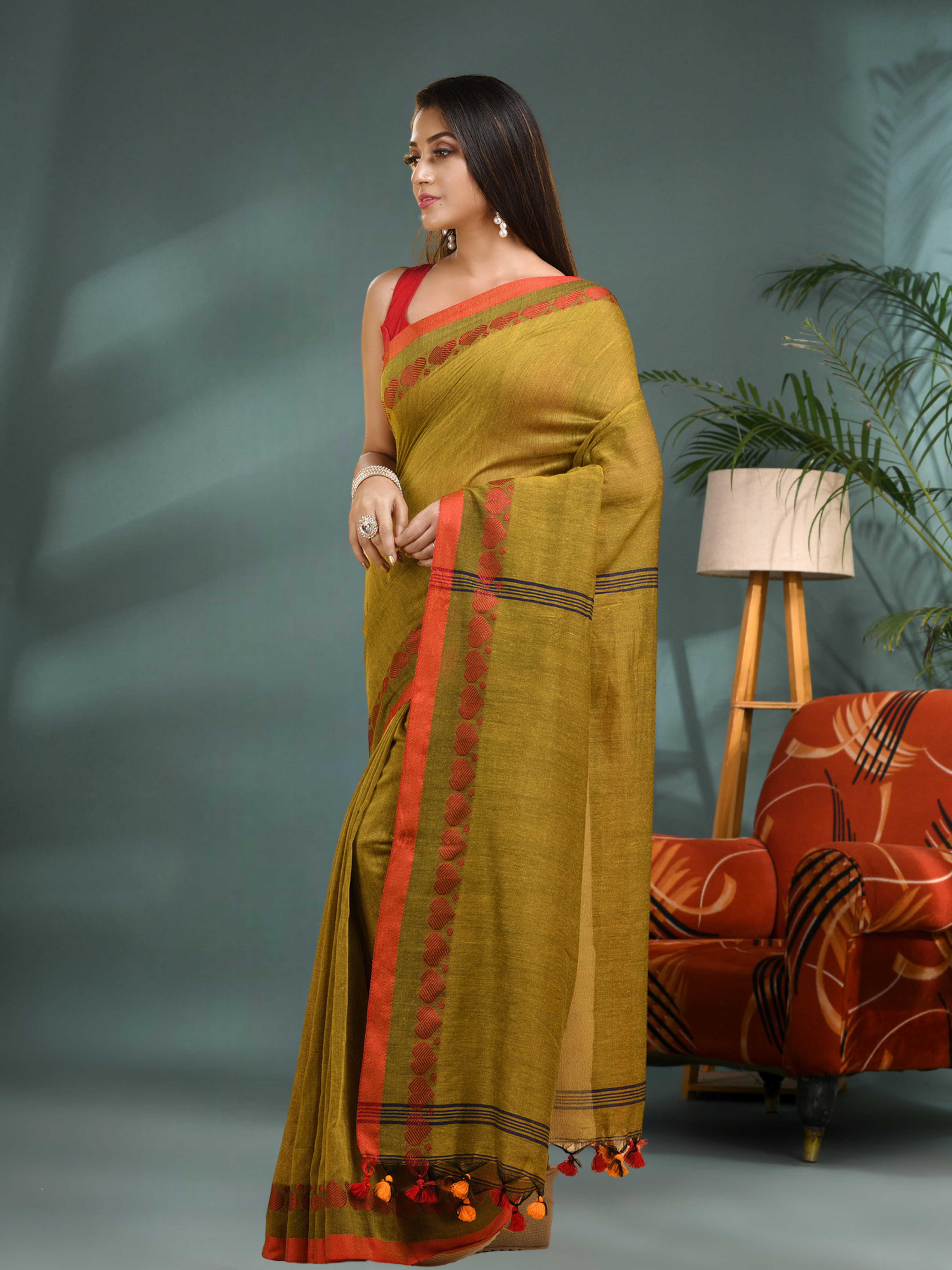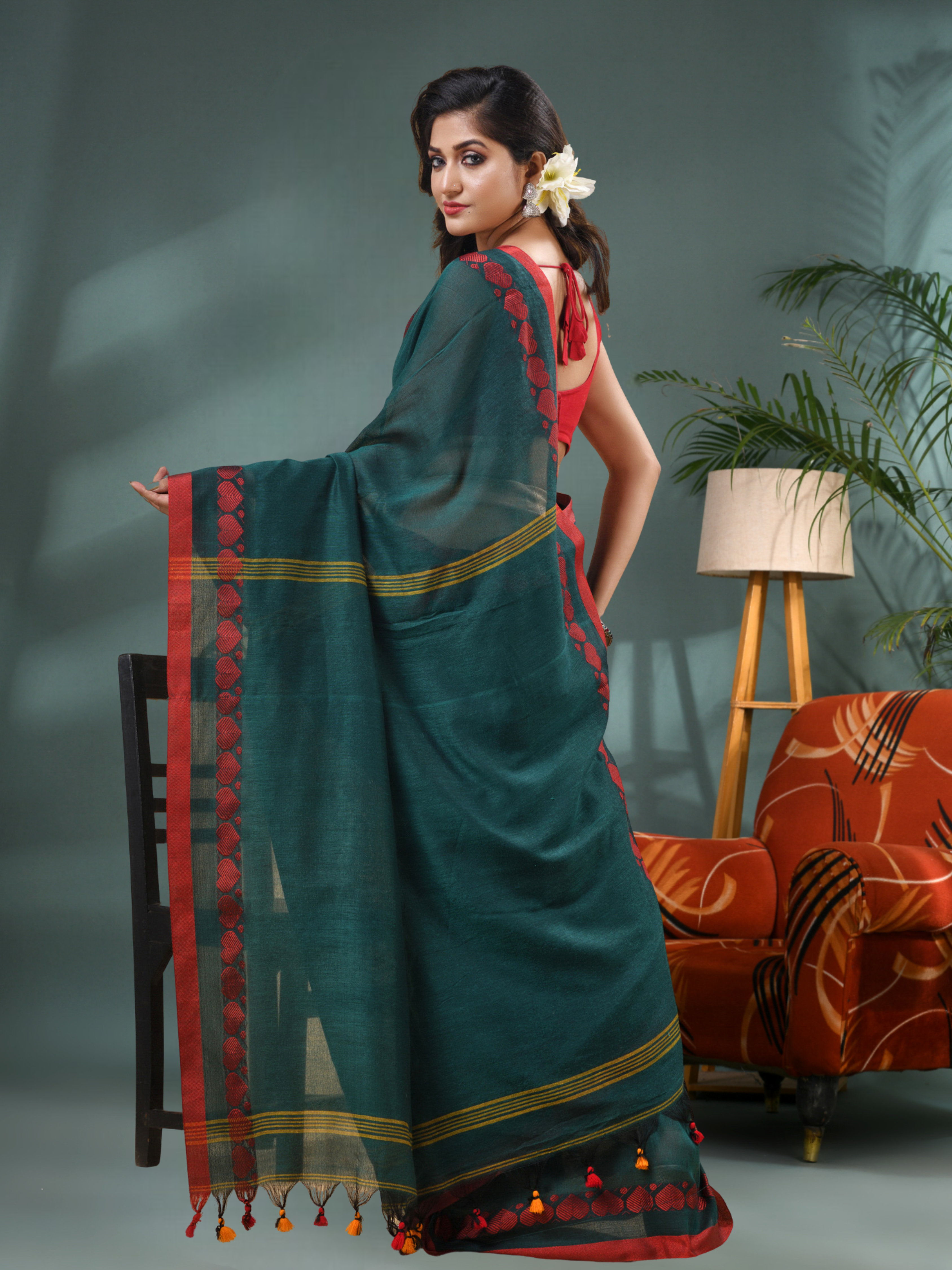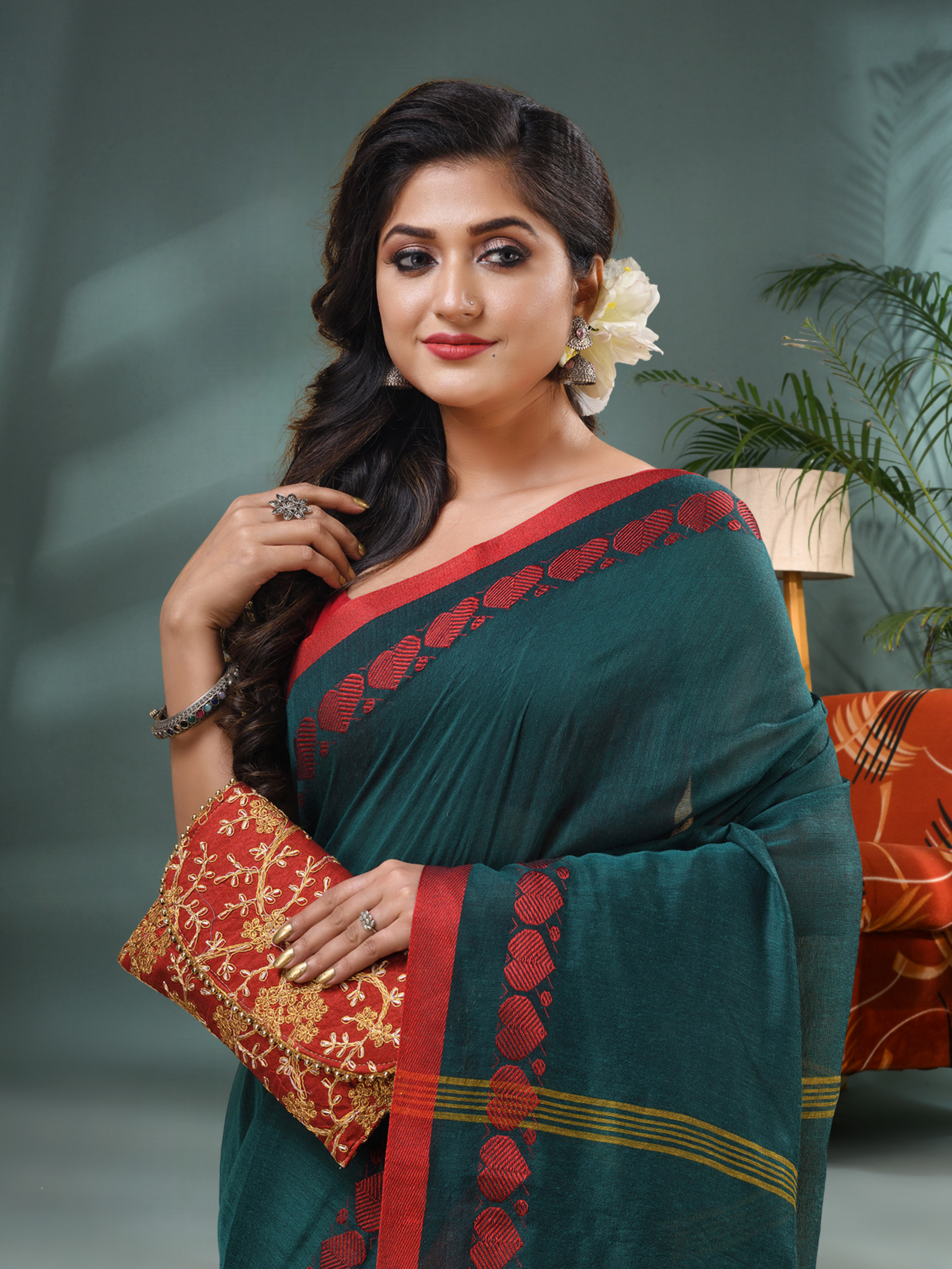 Available in vibrant shades like Castleton Green, Cranberry, Deep Blue, Yellow, and Olive, each saree brings out the charm of Bengali heritage with a modern touch. This pure cotton saree is breathable, lightweight, and ideal for Indian summers. Whether you're looking for a wedding dress for women, an ethnic dress, or a cotton saree online, this handwoven masterpiece fits every mood.
