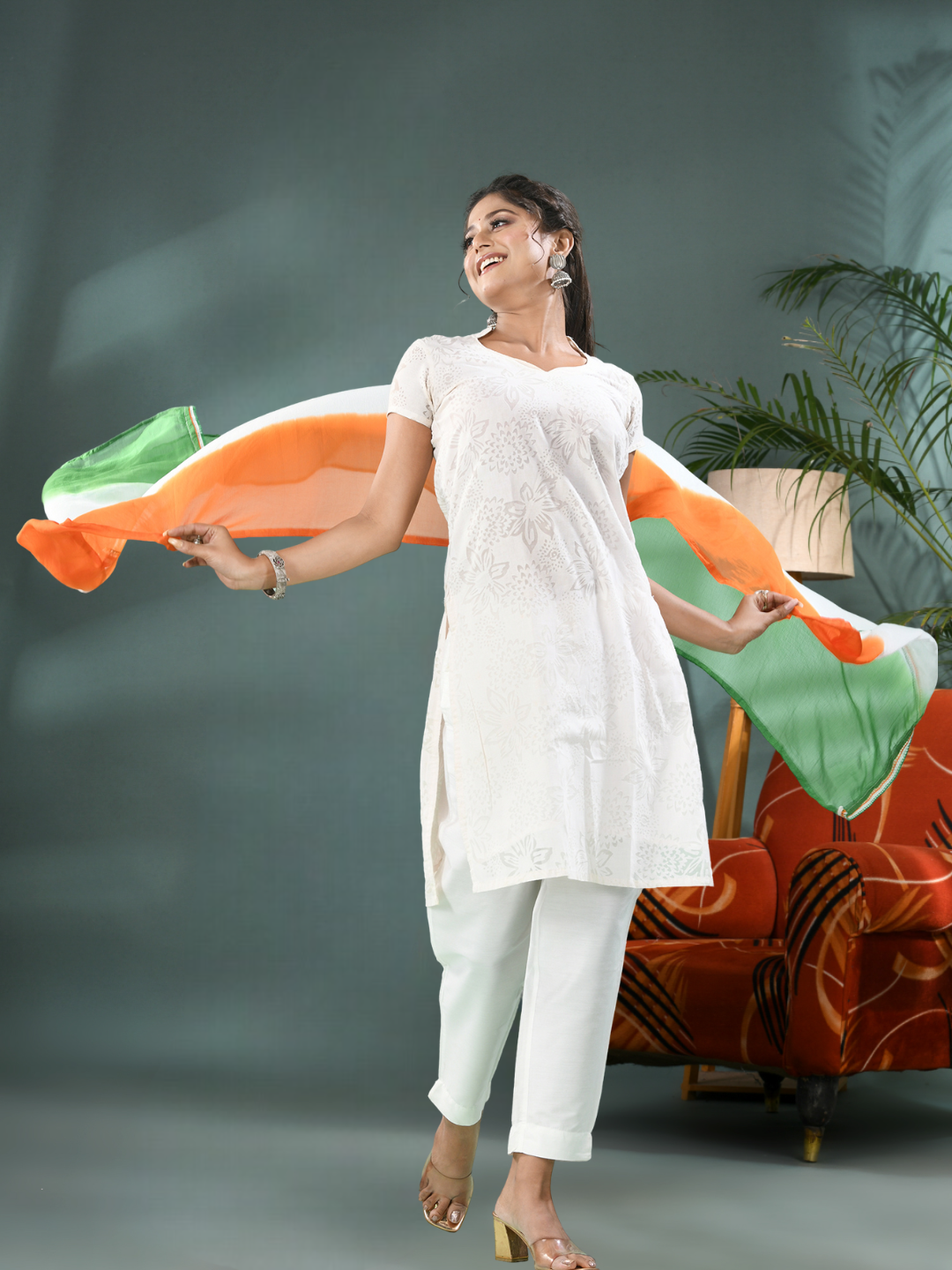 Whether you style it with white kurtas, cotton dress materials, or use it as a statement scarf, this tricolor dupatta adds a timeless charm to your ethnic wardrobe. Perfect for those seeking chiffon dupatta online with a patriotic twist.