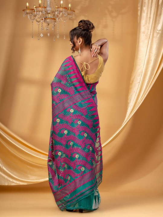 Experience the elegance of traditional Indian craftsmanship with the DESH BIDESH Fluorescent Green Pure Cotton Jamdani Saree. This exquisite drape features vibrant fluorescent green and off-white hues, adorned with intricate ethnic motifs. The pure cotton fabric ensures exceptional comfort and breathability, making it ideal for various occasions. A beautifully woven design border enhances its aesthetic appeal, adding a touch of sophisticated charm. This saree is a testament to timeless style, blending traditional artistry with contemporary fashion sensibilities. Its lightweight nature allows for graceful draping and effortless movement. Perfect for festive celebrations, cultural events, or daily wear, this saree offers unparalleled versatility. Maintain its pristine condition with professional dry cleaning. Embrace cultural heritage and refined elegance with this distinguished Jamdani saree. It promises a distinguished presence and lasting comfort.