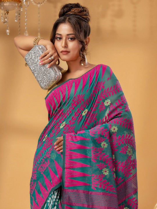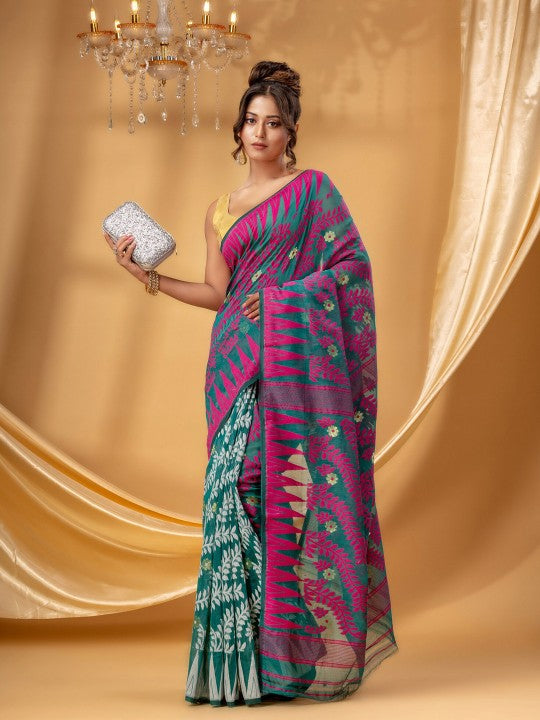 Tamarind Leaf Resham Dhakai Jamdani Pure Cotton Handloom Saree Whole Body Design without Blouse Piece