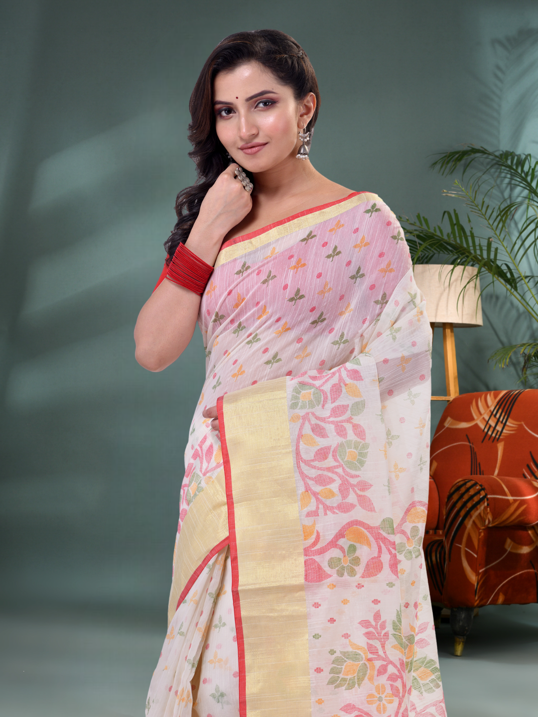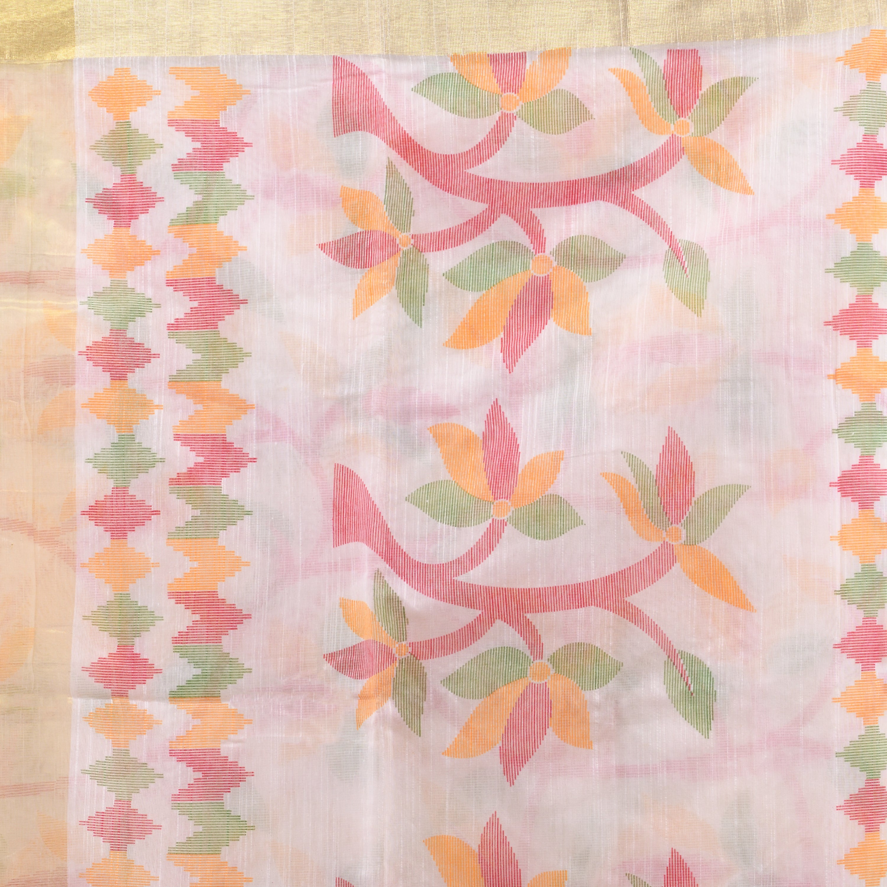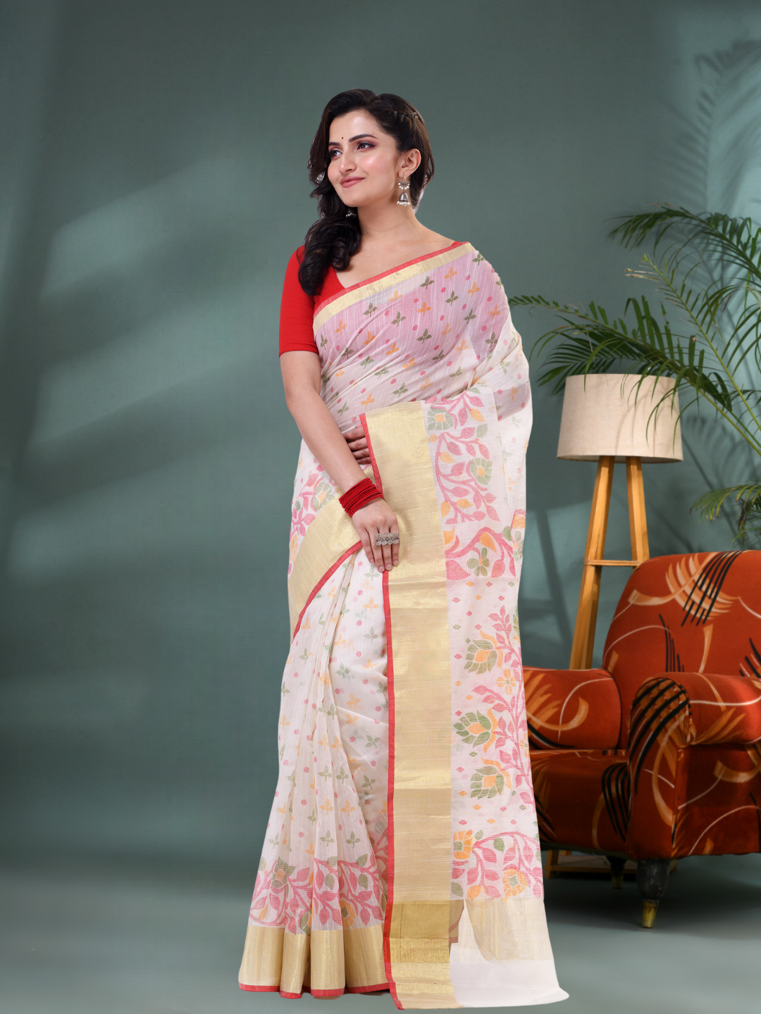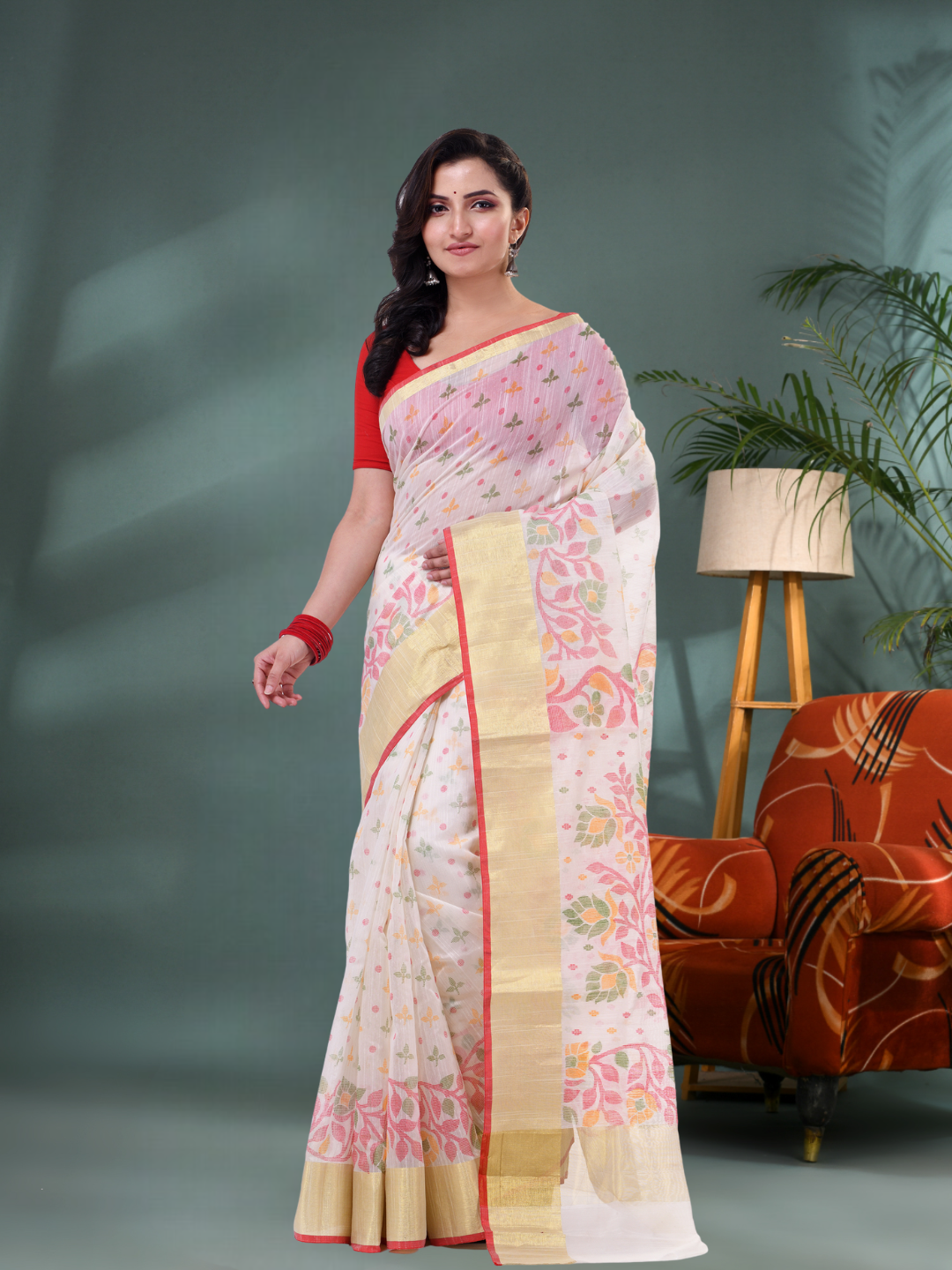 Cotton Silk Handloom Saree - White Floral Leaf Design with Blouse Piece